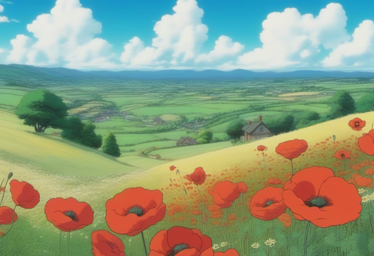 DVD screengrab from studio ghibli movie, beautiful countryside with poppies in the foreground, clouds on blue sky, highly detailed, UHD, directed by Hayao Miyazaki, retro anime [StyleSelectorSDXL - enhance]