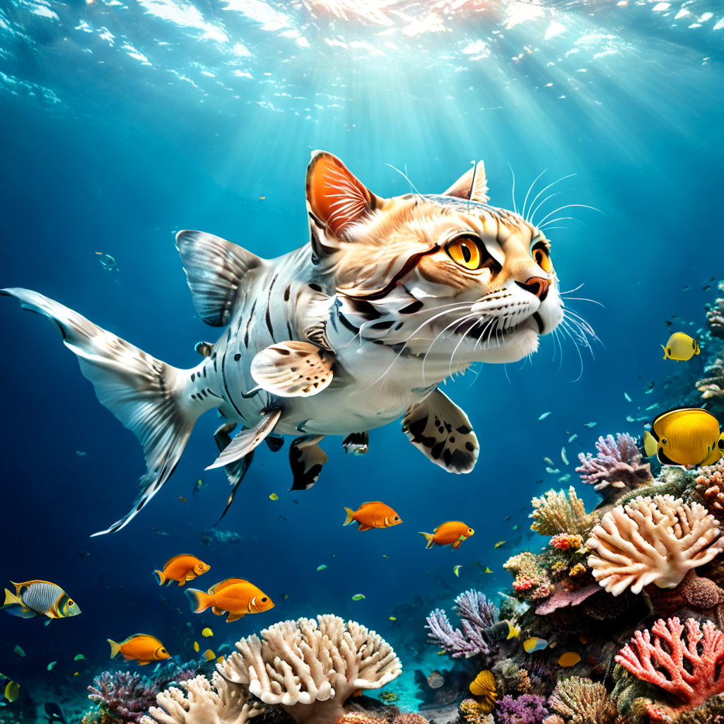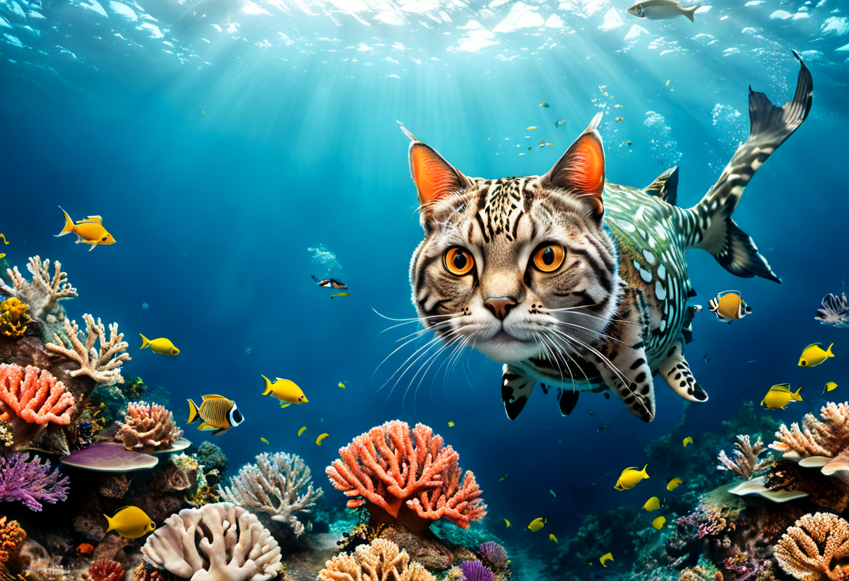 a fish with cat's head swimming in the ocean with a lot of fish and corals, underwater <lora:xl_more_art_full> [Style Selector - enhance]