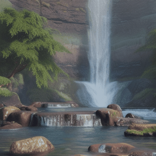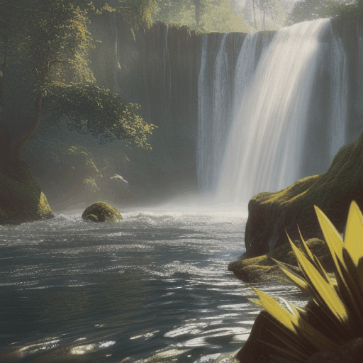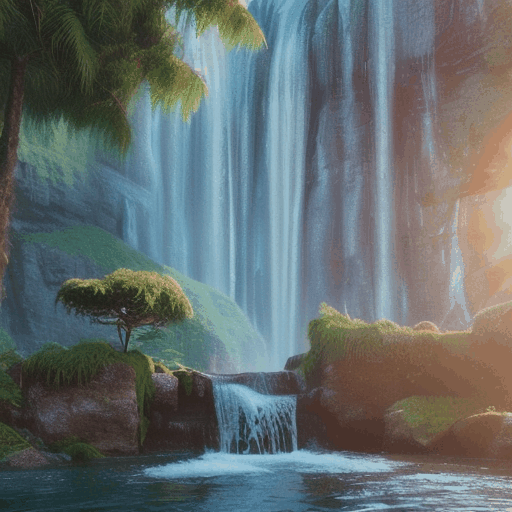 landscape photo of a waterfall, sun reflecting in the water, unreal render, octane render, 8k, ray-tracing, high detail, sharp focus, unreal, extreme illustration, concept art, complex