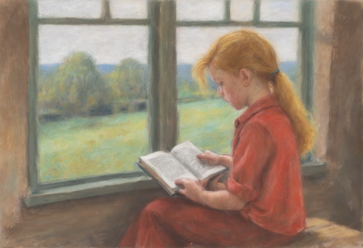 pastel drawing of 1girl reading a book by the window, red shirts, golden hair <lora: PasteldrawnXL>