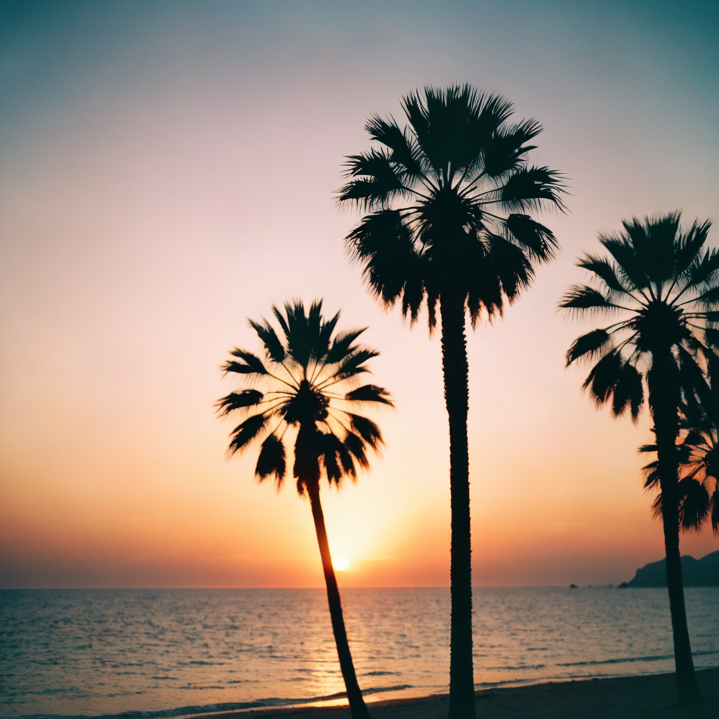 analog photo, palm silhouettes, ocean, sunset, summer vibes, vibrant colors, soft focus, haze, film grain [Style Selector : analogue film]