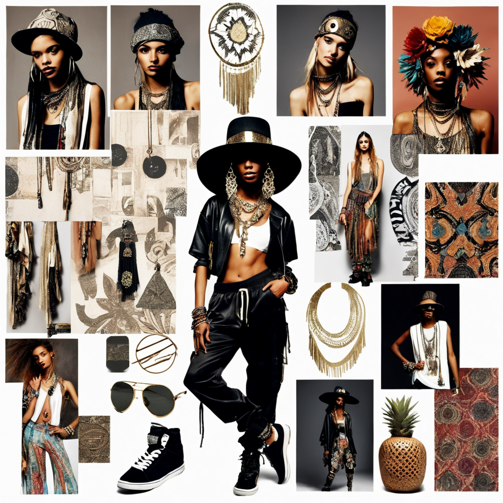 fashion moodboard for bohemian fashion line, in the style of hip hop