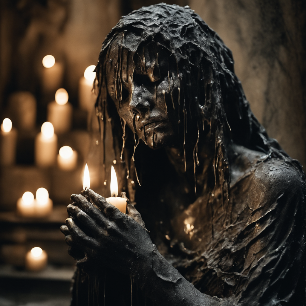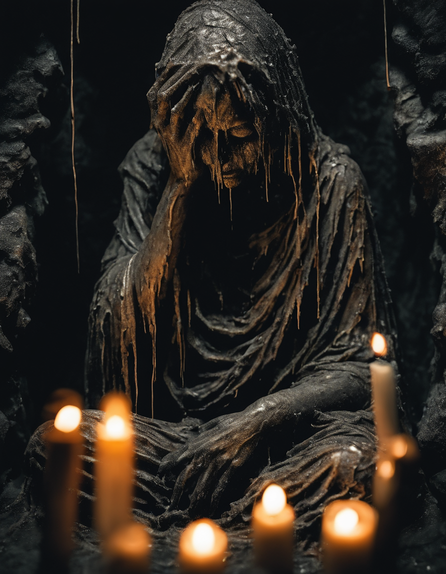 a photo of the statue of the personification of grief covered with candles and hot wax, covering the face with its hands, black tears dripping from the cheeks, the whole statue is covered in dense cobwebs and grease, higly detailed, black isolatet cave, tarnished, grunge, glowing cracks