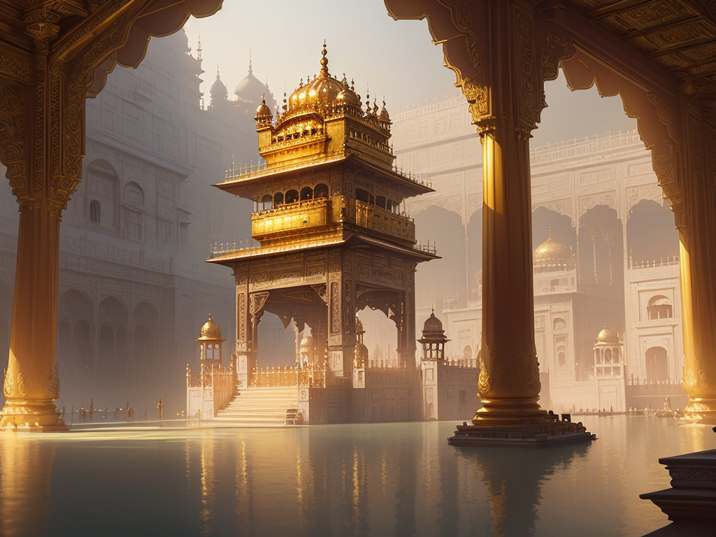 inside golden temple, magical scene, dazzling glow, bright lighting, 8k, intricate, elegant, highly detailed, majestic, digital photography, art by artgerm and ruan jia and greg rutkowski, hdr