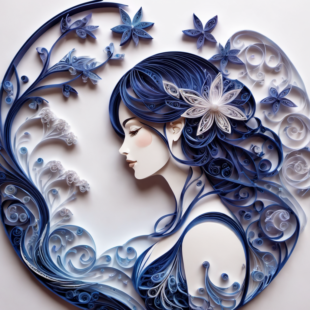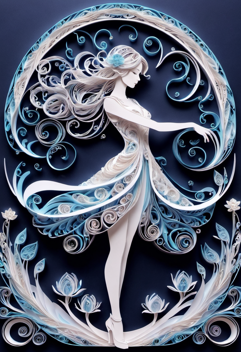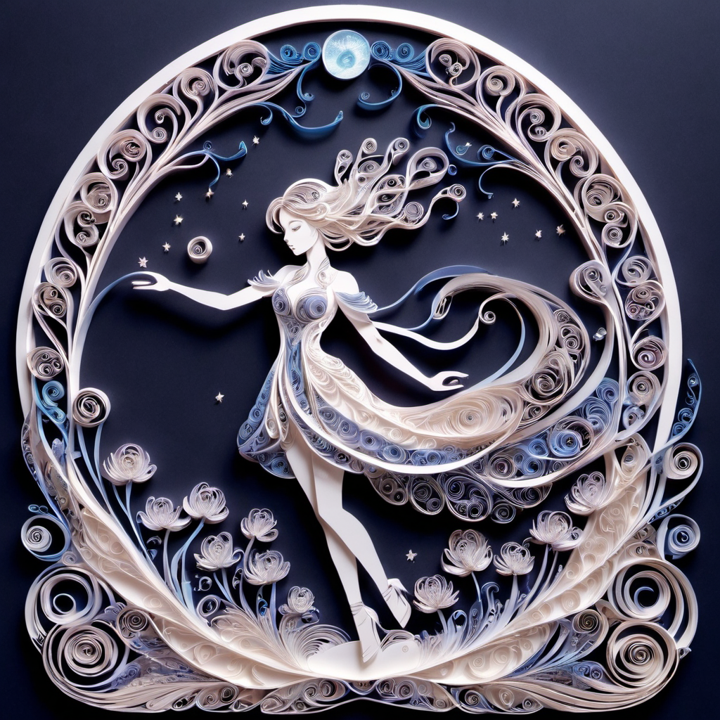 an image of person with her arms down, in the style of dan mumford, kilian eng, whimsical and fantastical elements, yumihiko amano, swirling vortexes, celestial, delicate coloring [Style Selector - paper quiling]
