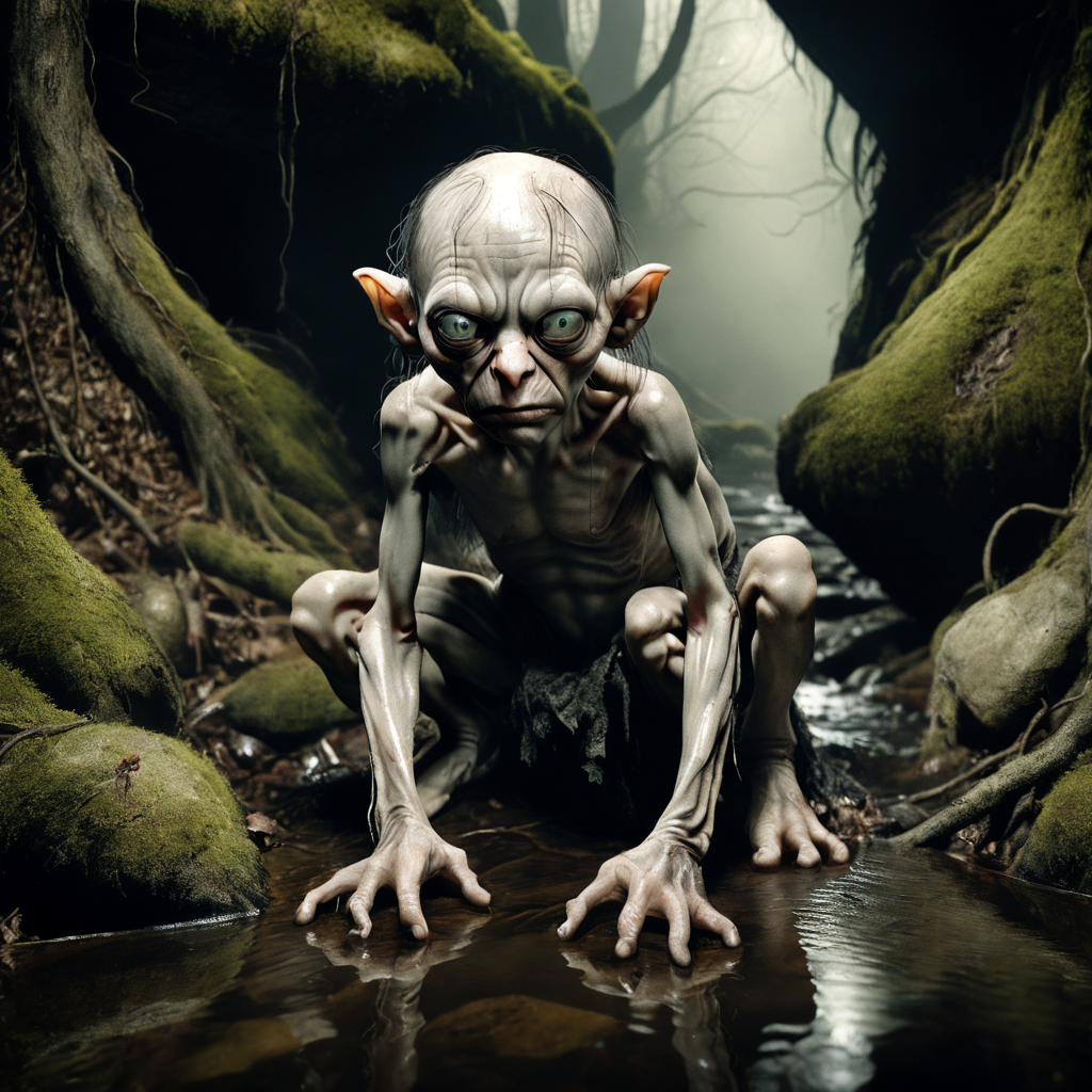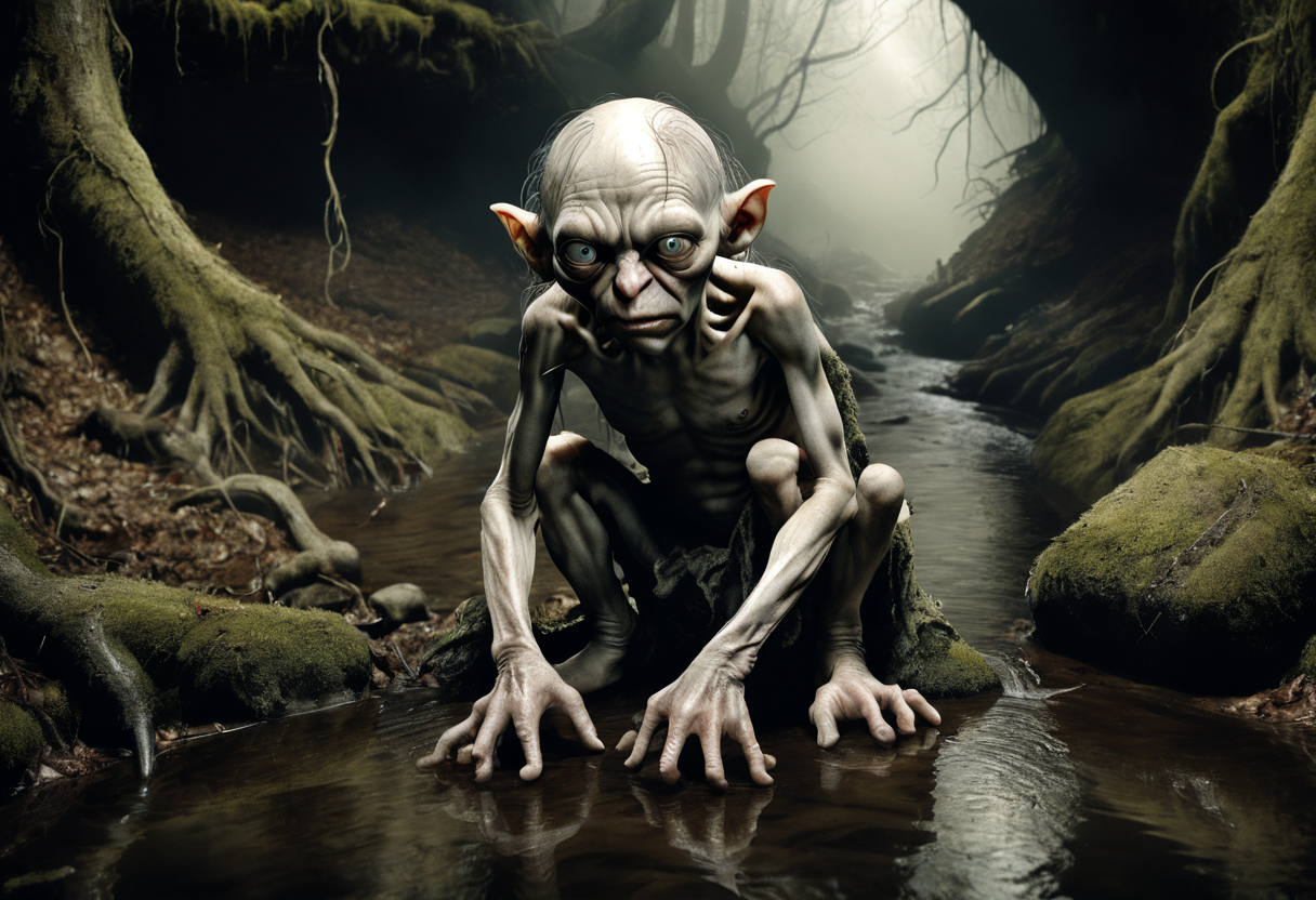 realistic photo of a Gollum, crouched by a small stream in the heart of a deep forest, appears anxious and fearful as he gazes <lora:xl_more_art_full> [Style Selector - horror]