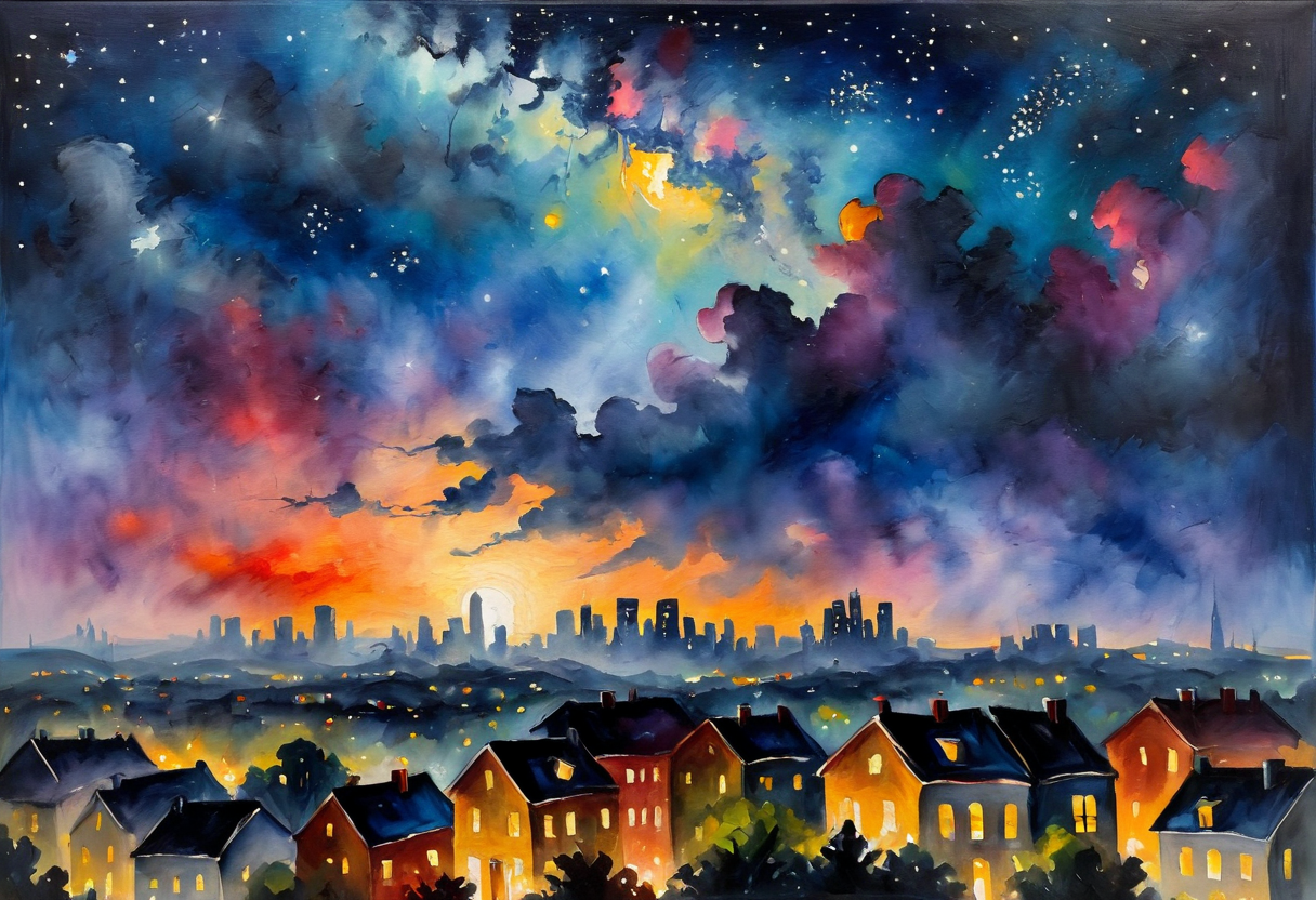 occtans, sky, star(sky), scenery, starry sky, night, night sky, outdoors, building, cloud, milky way, sitting, tree, city, silhouette, cityscape <lora:xl_more_art_full> [Style Selector - cinematic]