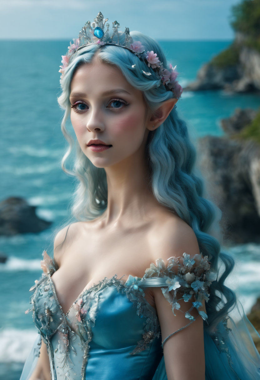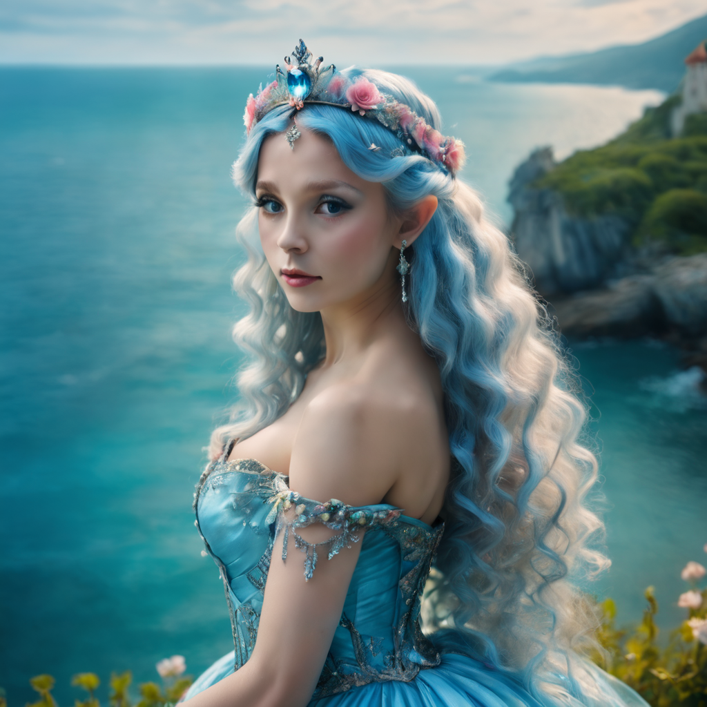 A portrait of a fairy princess, tiara, long flowery hair, fantasy, soft background, sea-like , bluish dress, bare shoulders, UHD, 8k, beautiful composition, a modern surrealistic <lora:xl_more_art_full> [Style Selector - fairy tale]