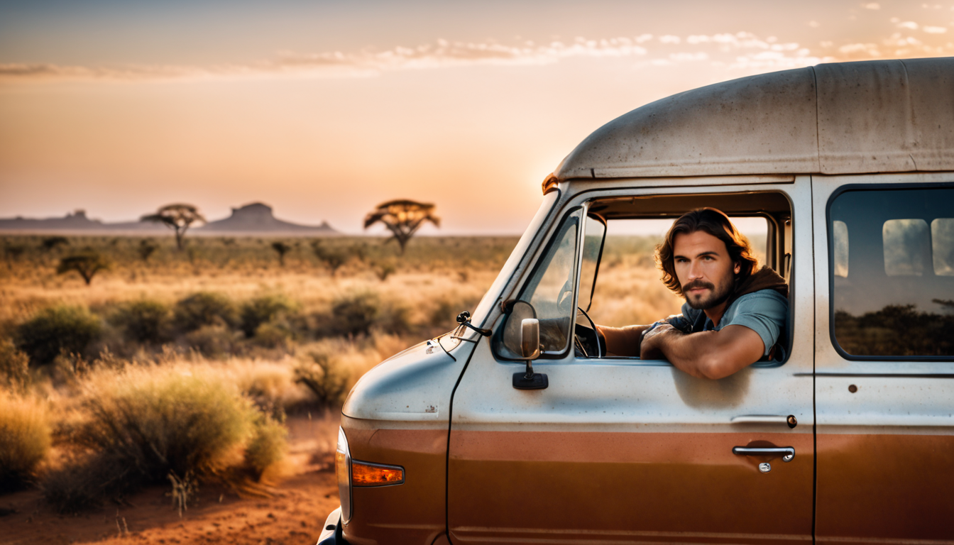 an explorer peeking from a van's window, a savanna, cinematic lighting, vibrant colors, bokeh, movie poster style <lora:xl_more_art_full> [StyleSelector - cinematic]
