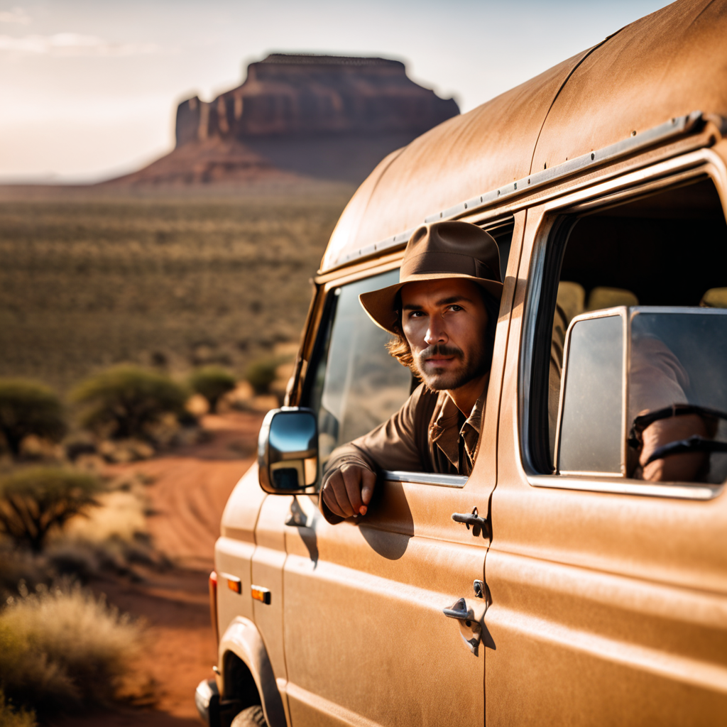 an explorer peeking from a van's window, a savanna, cinematic lighting, vibrant colors, bokeh, movie poster style <lora:xl_more_art_full> [StyleSelector - cinematic]