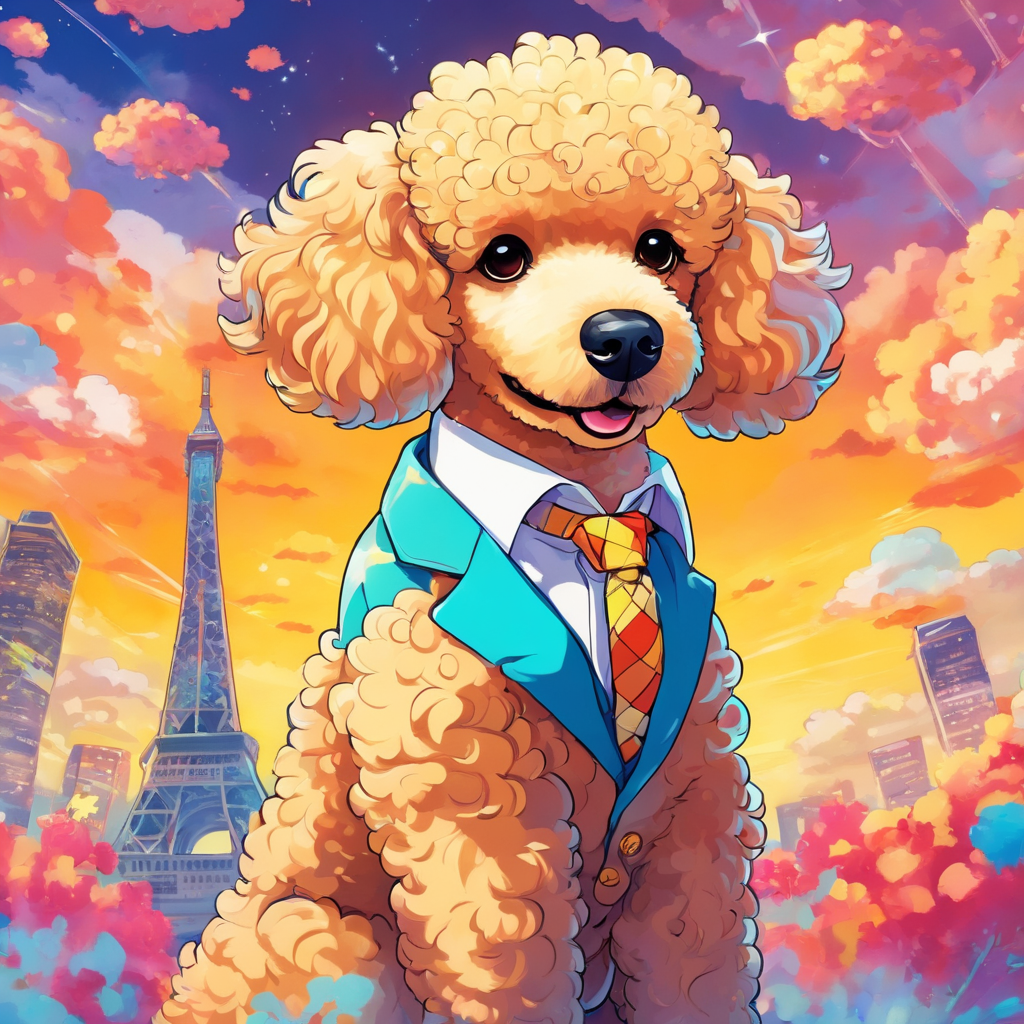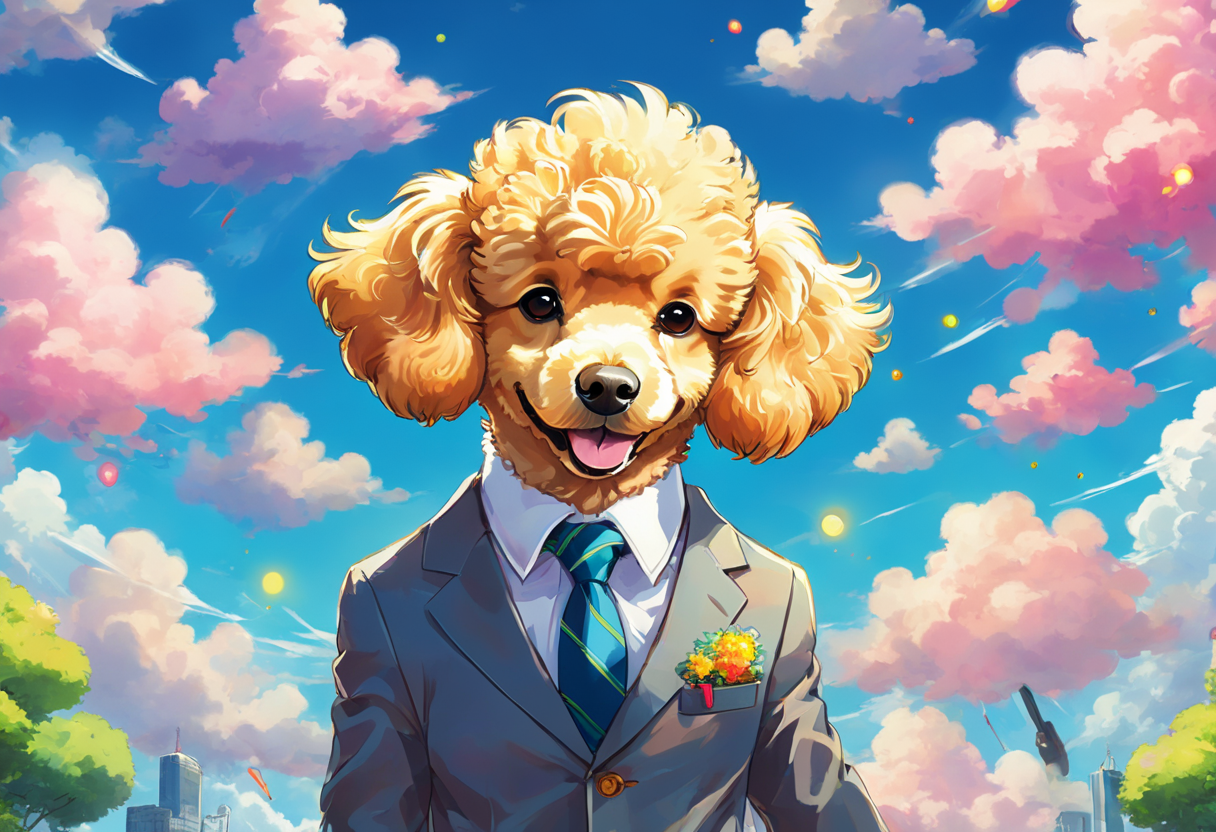 A painting of a cute golden poodle wearing a suit, in the sky, with bright colors, natural light, by Studio Ghibli