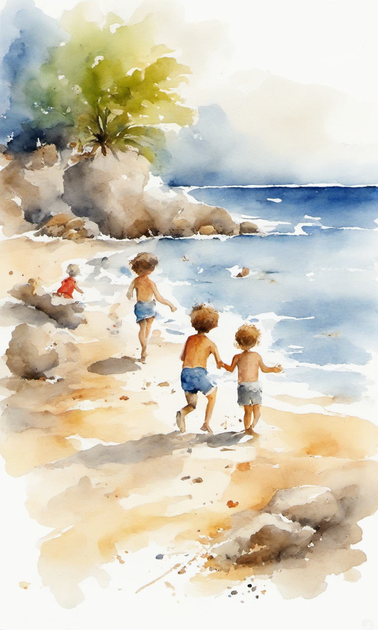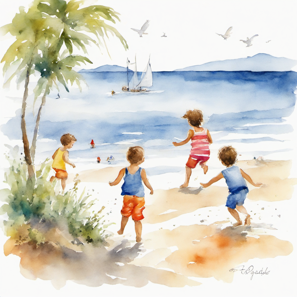 children playing at the beach, bright, white background, few details, dreamy, Studio Ghibli style [Style Selector: watercolor]