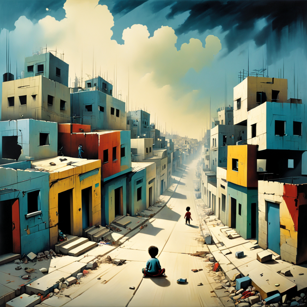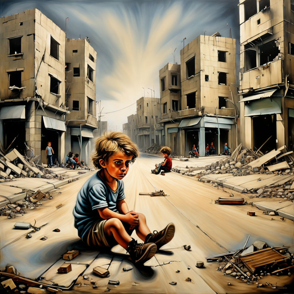 oil painting of child sitting in the middle of a wide empty city street, childrens playing together, in Palestine Gaza Strip, buildings demolished by bombings, by Eyvind Earle