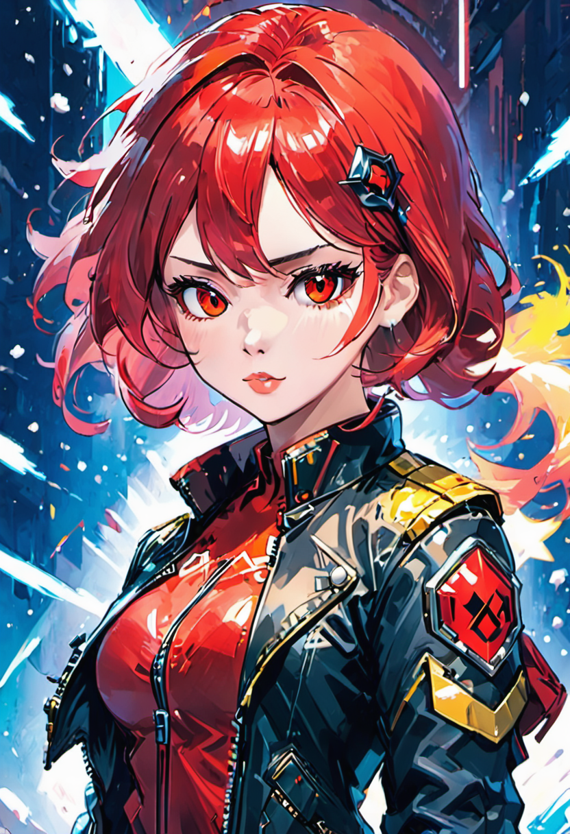a painting of a woman in a leather jacket, racing queen, trending on artstaion, loba andrade from apex legends, red and black details, character art closeup, portrait of snow white, luminous red eyes, pc boxart, angular <lora:xl_more_art_full> [Style Selector - anime]