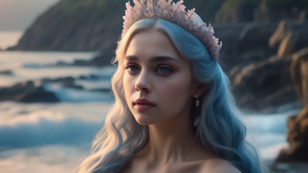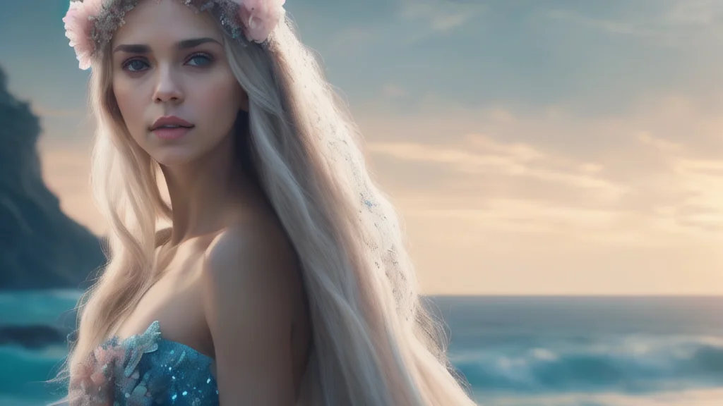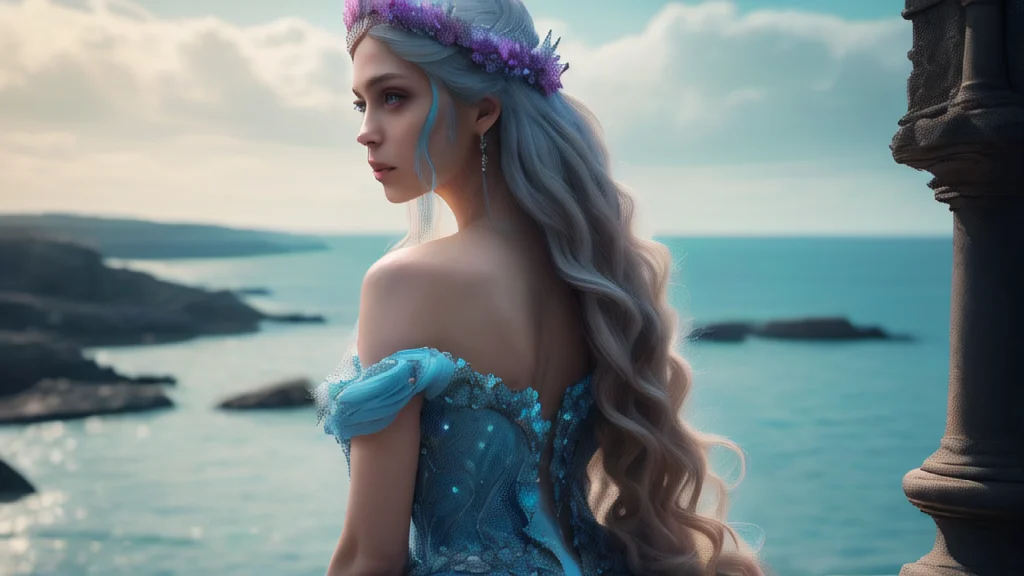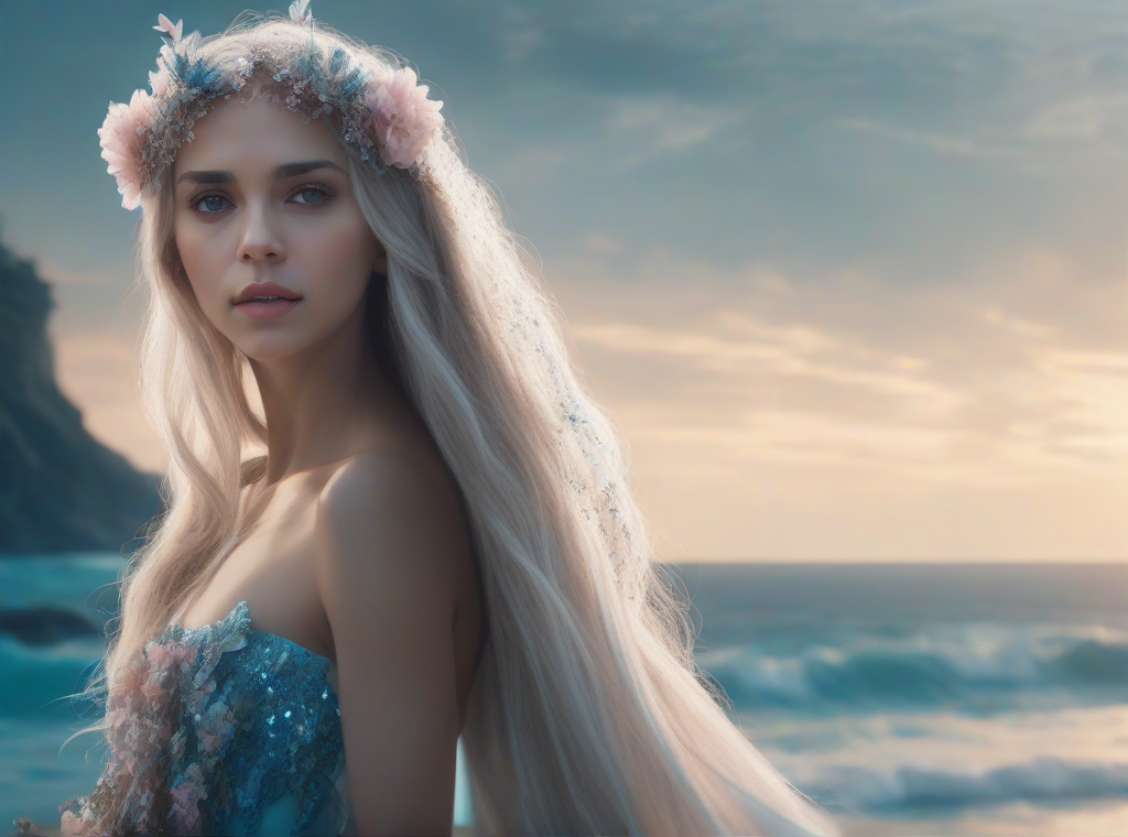 프롬프트: A portrait of a fairy princess, tiara, long flowery hair, fantasy, soft background, sea-like , bluish dress, bare shoulders, UHD, 8k, beautiful composition, a modern surrealistic