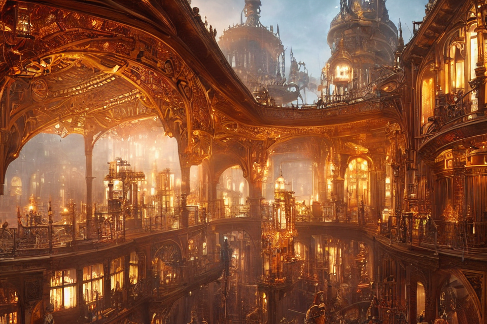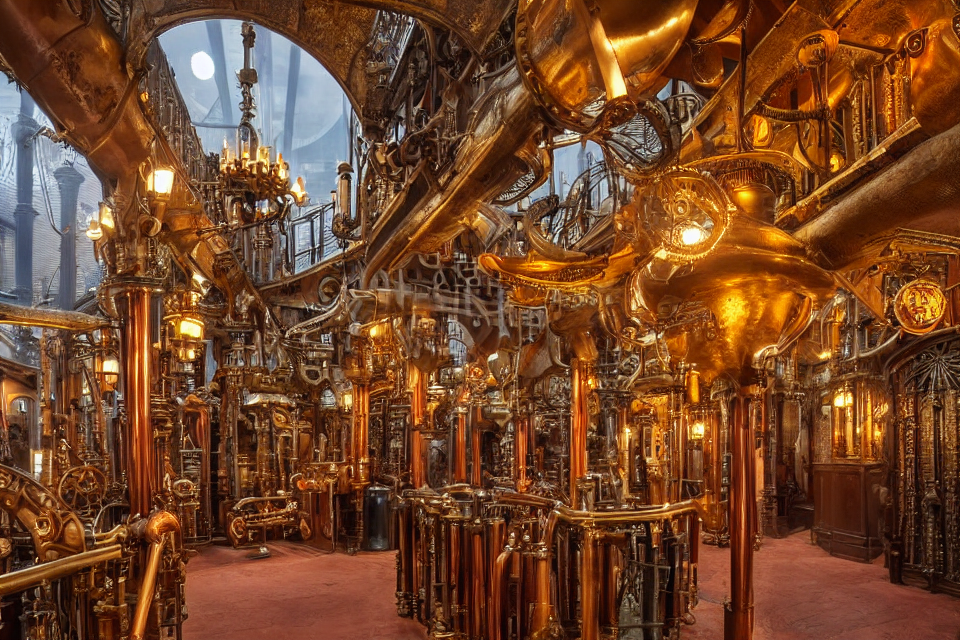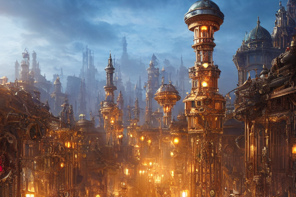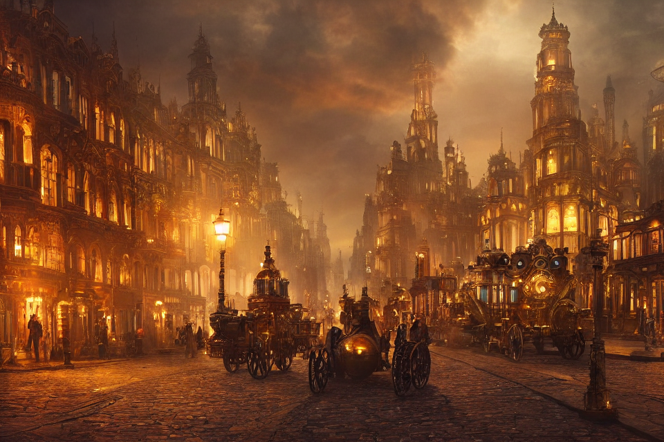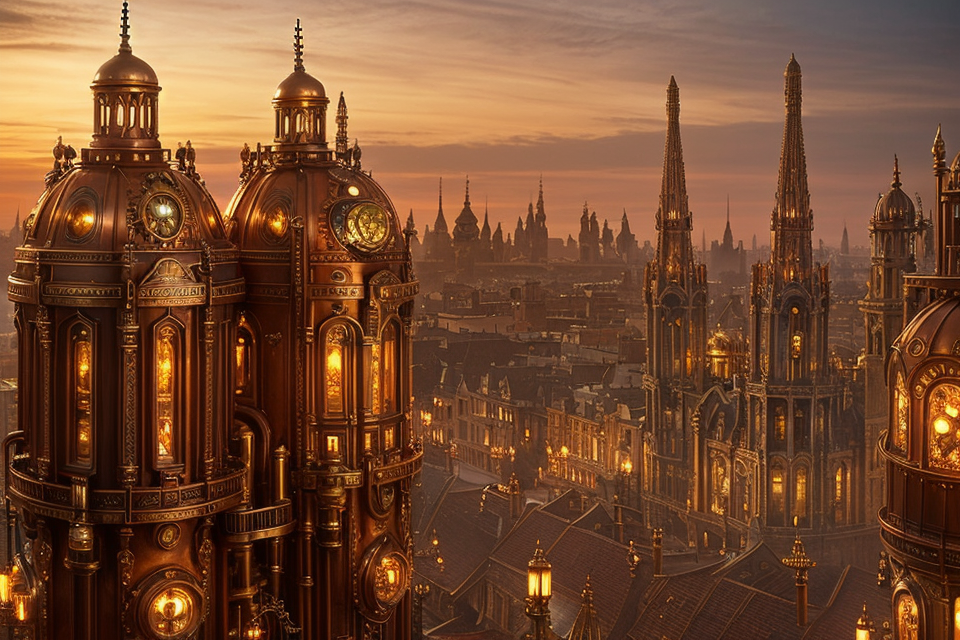 프롬프트: polished copper metallic steampunk city , buildings, retrofuturism, like lady mechanika, victorian city, fantasy, biomechanical railroad, cinematic lighting <artstyle: steampunk>