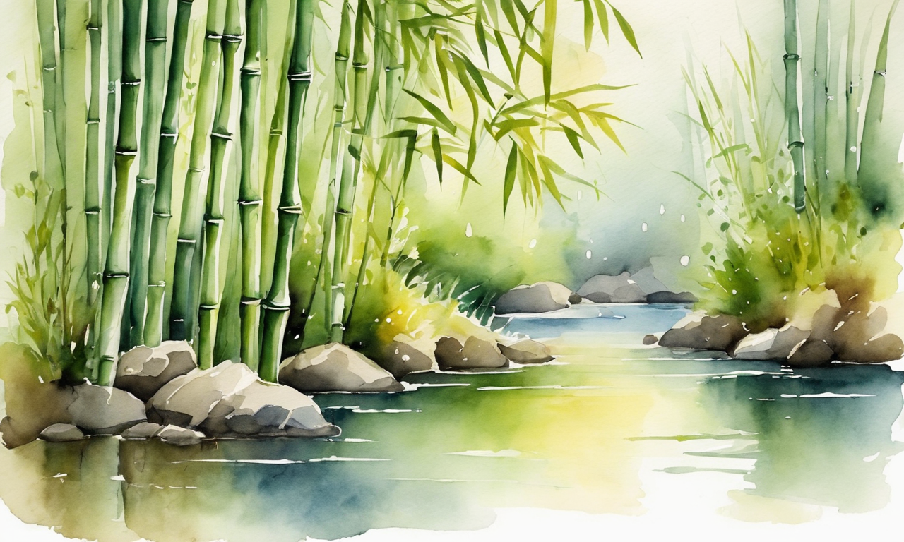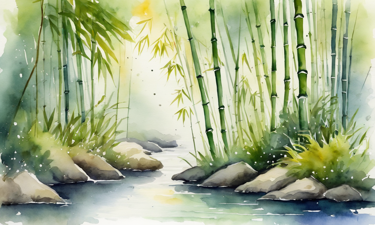 light watercolor, Bamboo forest, bright, side view,simple white background,Small river, few details, Ghibli, fairy tale [Style Selector - watercolor]