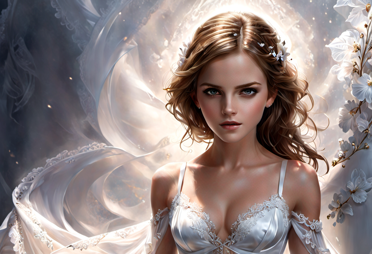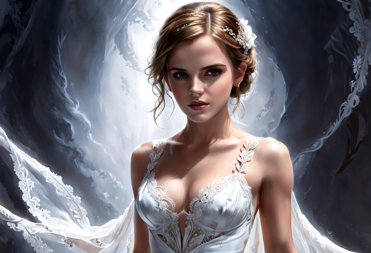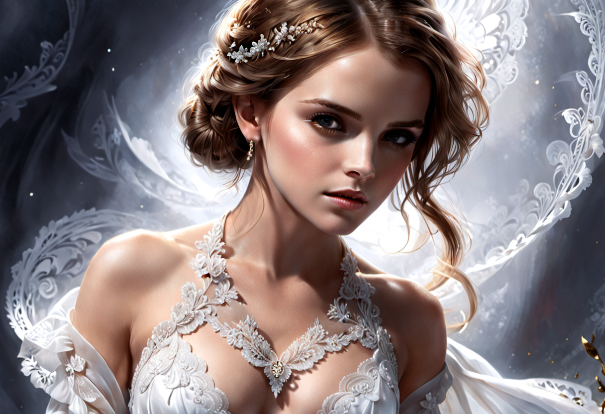 프롬프트: half body photo of [blade lively:emma watson:0.1], white roman translucent lace gown, victoria secret model, D&D, shiny background, intricate, elegant, highly detailed, digital painting, artstation, sharp focus, illustration, artgerm, bouguereau, spiral