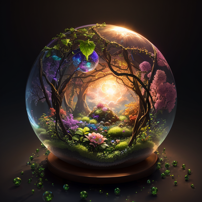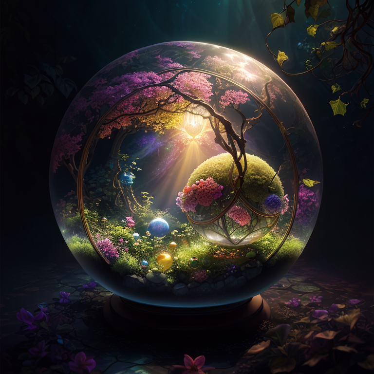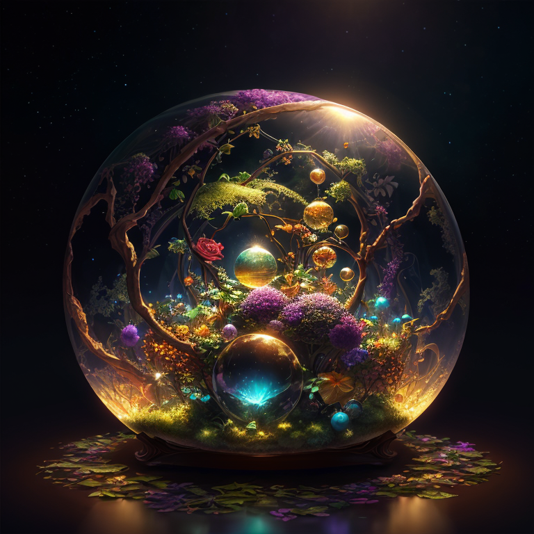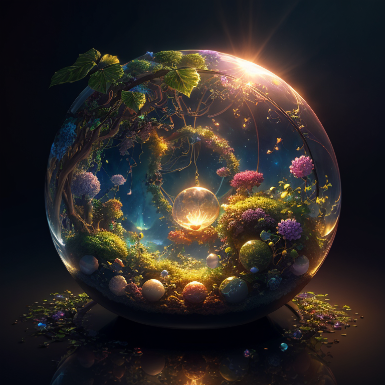 프롬프트: spherical Terrarium, abstract dream, flower, brushes, ivy, foliage, wild, orb, fantasy, complex, gemstone, highly detailed, intricate, elaborate, octane render, 4k HDR, colorful, fractal, black background, eco system, glowing, reflection, crepuscular rays, luminescence