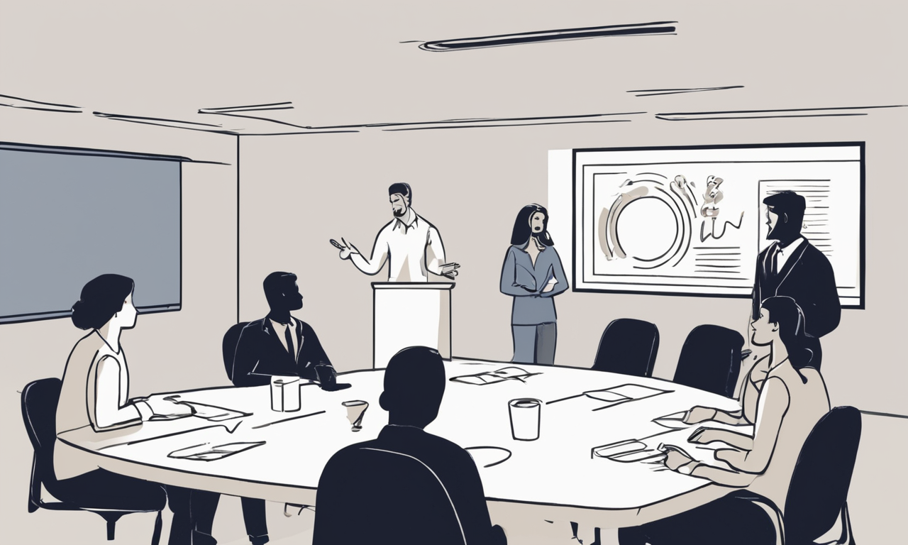 illustration of meeting room, one woman presenting and men and women discussing besides table