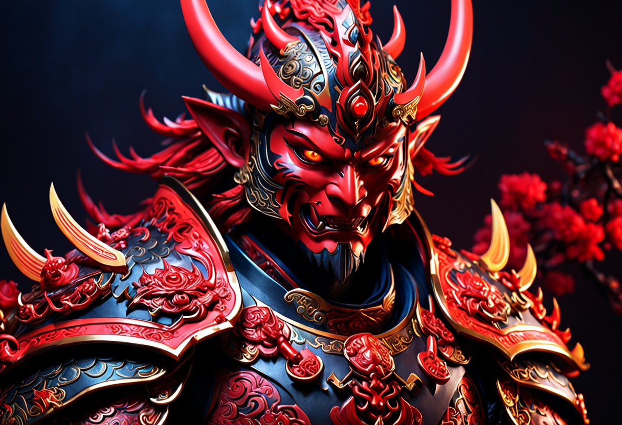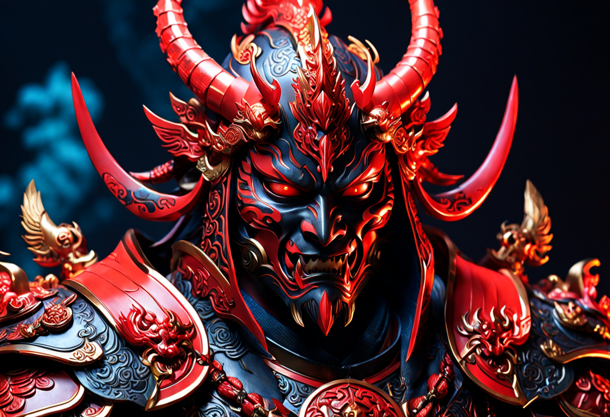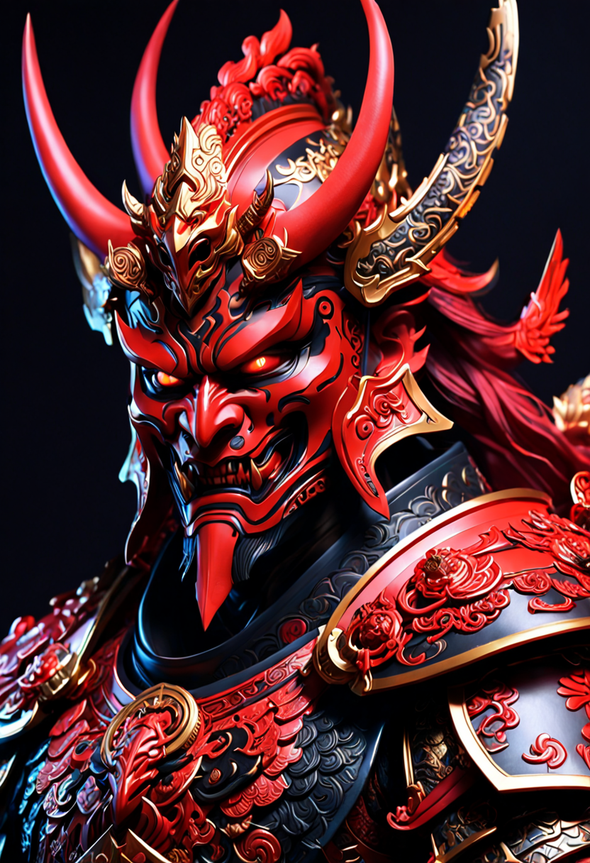 프롬프트: close up of arafed statue of a demon with red eyes and a red eye, cgsociety and fenghua zhong, wearing samurai armor, portrait of a cosmic god, intricate devilish designs, 3 d goddess portrait, inspired by Hirohiko Araki, red scales on his back, cycle render, the fire king, year 3022, painted character portrait, demon samurai, dark background, colorful, dramatic studio lighting, dark studio, dimly lit <lora: xl_more_art-full_v1> <lora: add-details-xl>