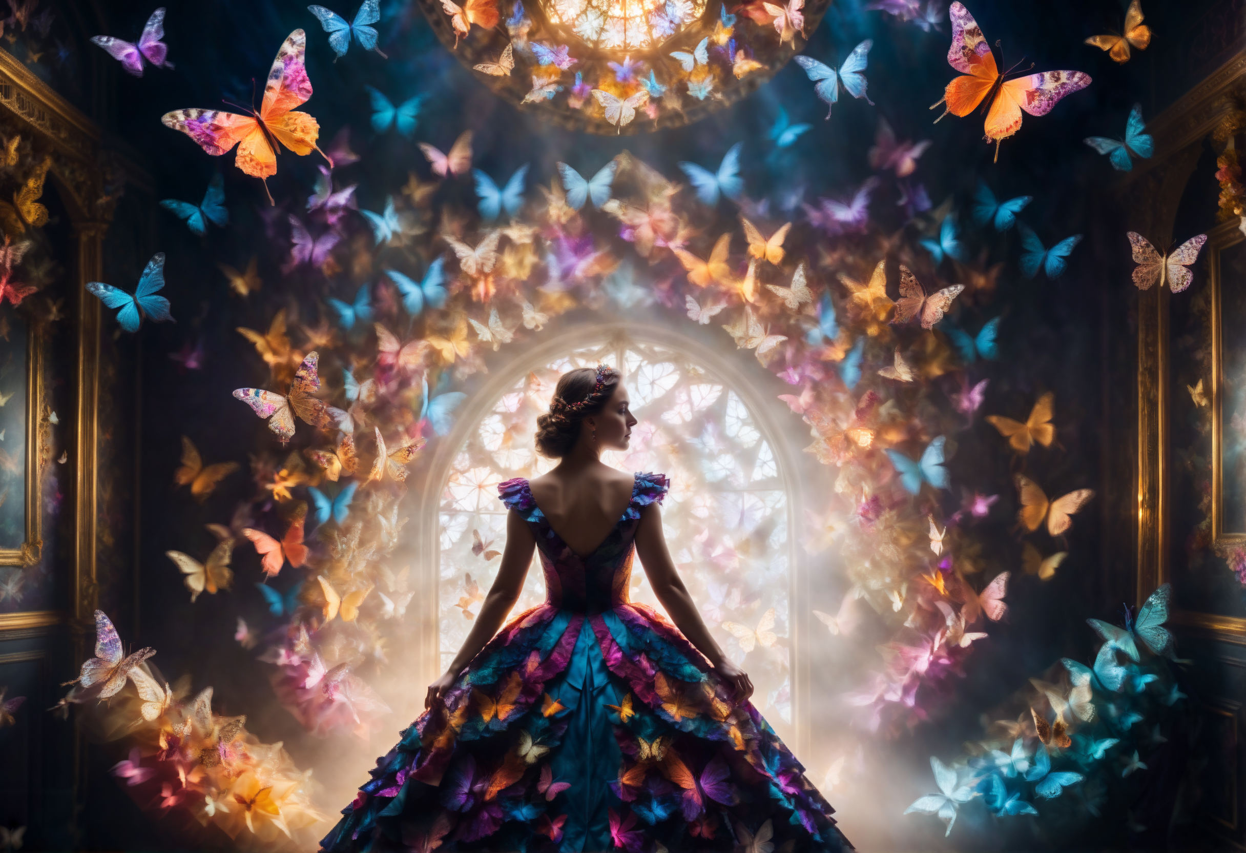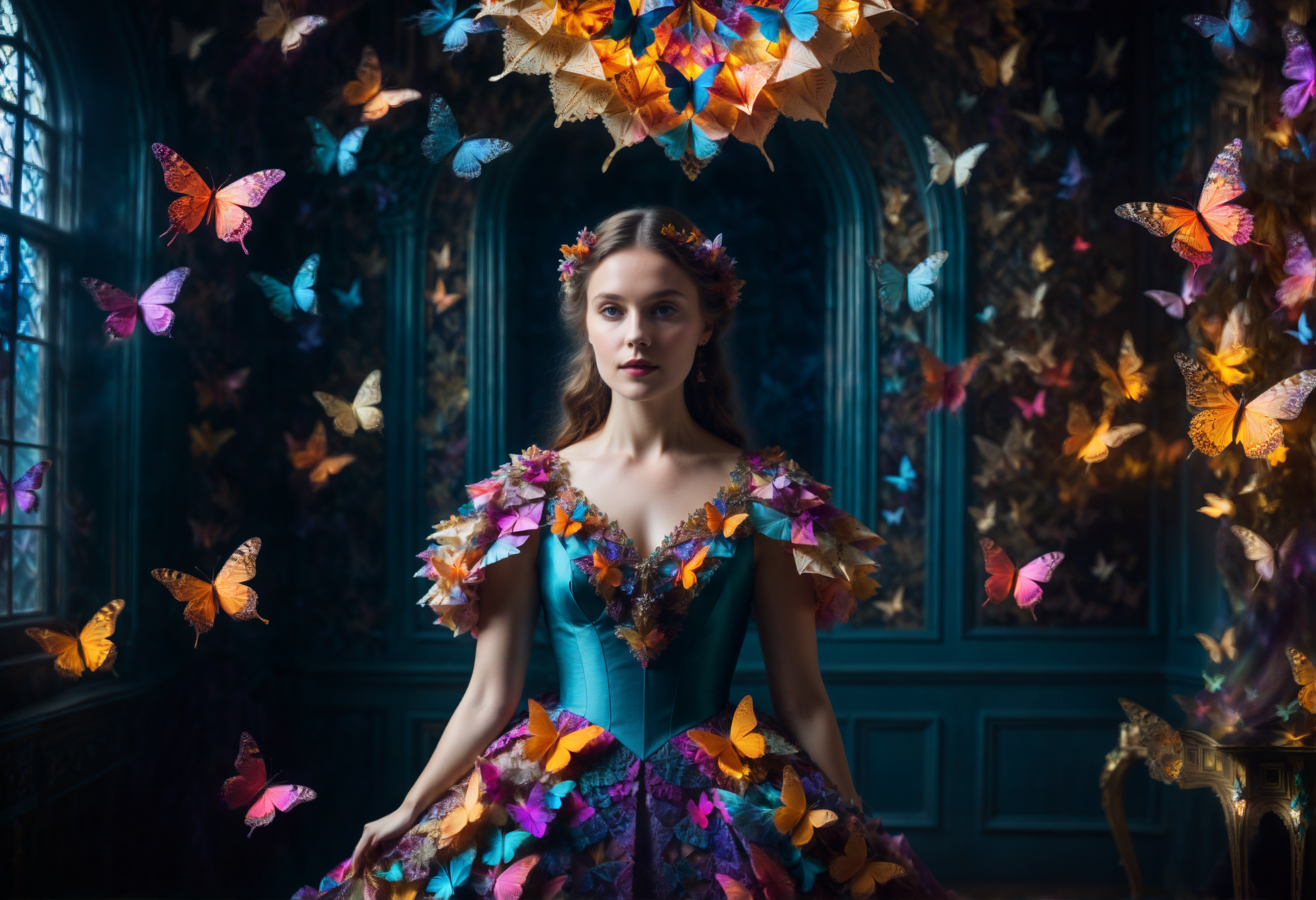 프롬프트: a woman in a colorful dress made of artistic chaotic origami surrounded by butterflies, look away, fractal, dreamlike magic realism, dark studio, dimly lit Victorian room <lora:offset_0.2:1> <lora:add-detail-xl:1> <lora:xl_more_art-full_v1:1>