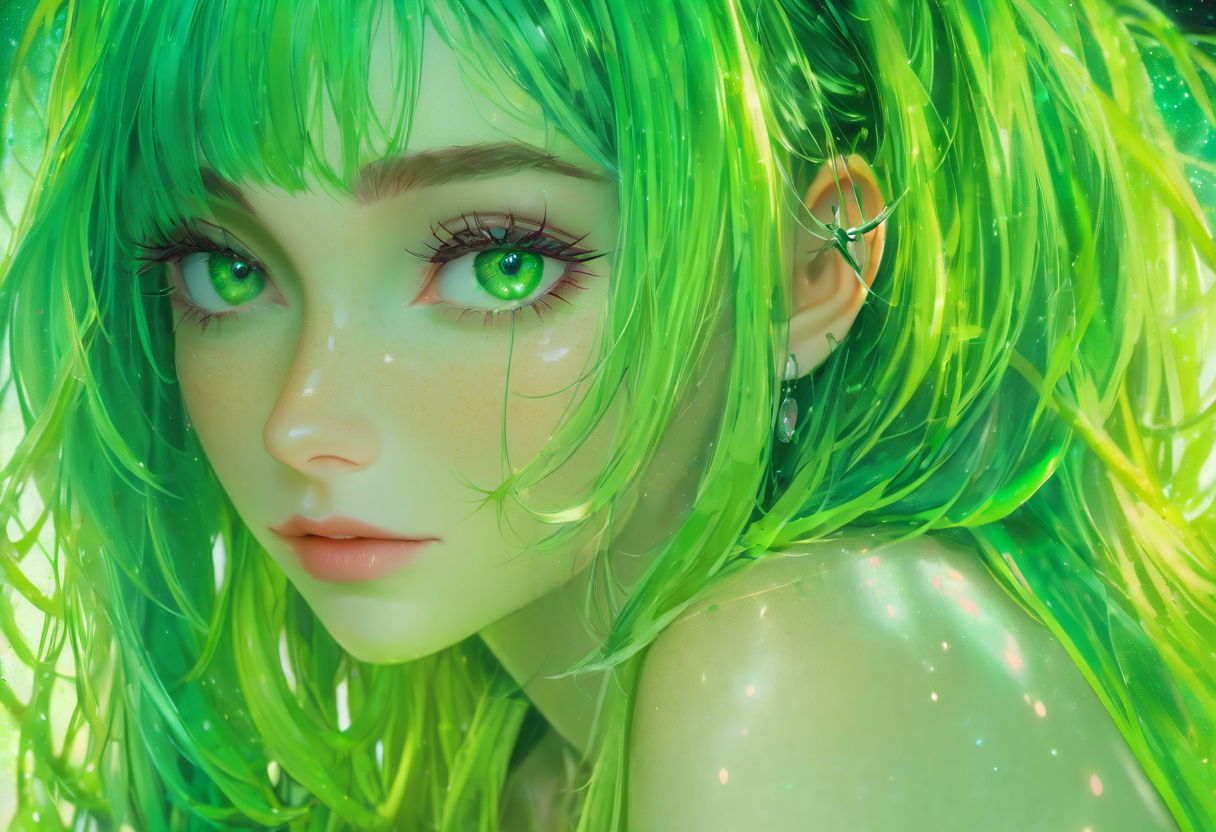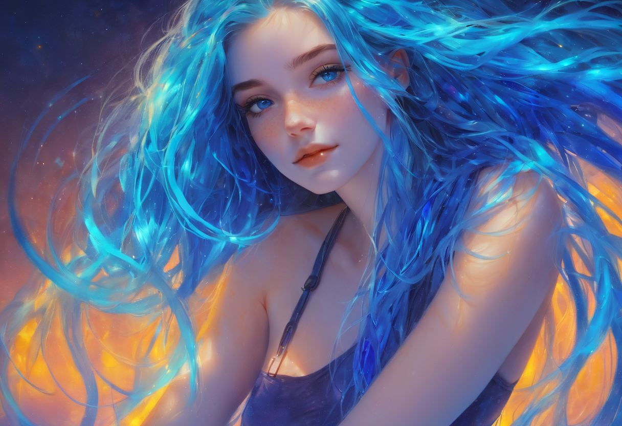 소녀의 눈동자는 마치 별빛을 담은 듯 푸르스름하게 빛났다. 네온처럼 빛나는 머리칼은 그녀의 머릿속에 비밀스런 우주를 품고 있는 것 같았다. 눈동자와 머리칼이 달콤한 꿈과 상상력의 세계를 열어놓는 듯했다. 그녀의 존재는 어둠 속에 반짝이는 작은 별처럼, 나의 가슴에 따듯한 감정을 가득 채워주었다. 그 소녀는 마치 우리 주변에 퍼져있는 평범한 일상을 환상적인 여행으로 바꾸어 놓은 듯 느껴졌다. 매 순간이 마법 같은 경험이었다.