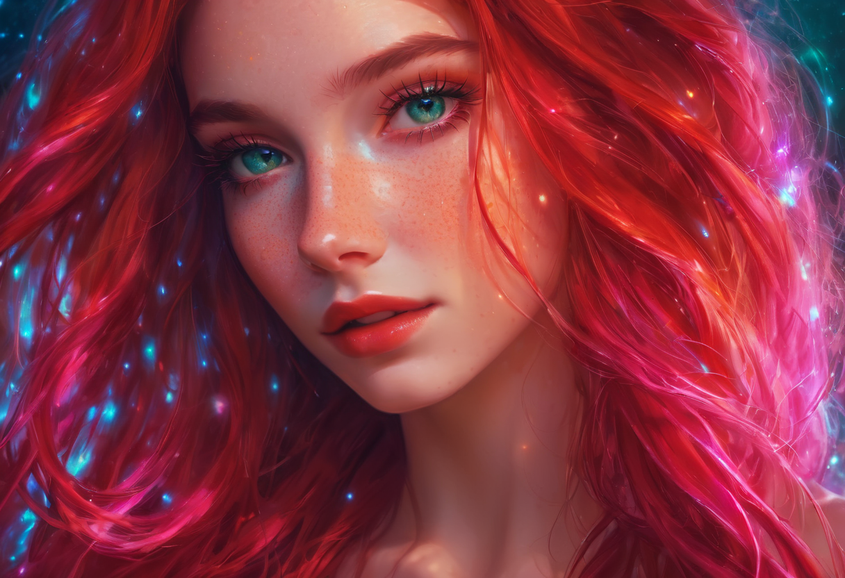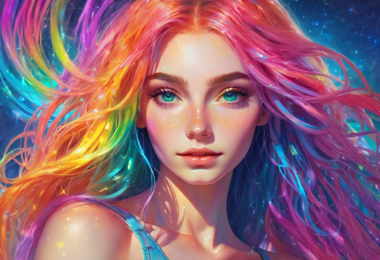 프롬프트: beautiful age 18 girl, long expansive (spiral:1.1) {blue|red|green|rainbow} neon hair, freckles, sexy, seductive, beautiful, dslr, 8k, 4k, textured skin, painting, vibrant color palette, softbox lighting, watercolor