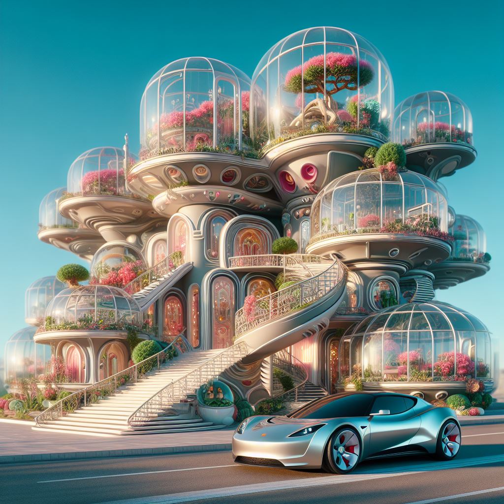 프롬프트: futuristic fancy apartment building with small bubble like structure and a staircase, ornated, high tech, highly complex, windows, retro balcony, greenhouse building, bonsai tree house, photorealistic anime, inspired by Bob Byerley, octane render, psychedelic floral planets, dreamworks animation, tesla roadster parked in front, daylight, shadow <lora: xl_more_art_full> <lora: add_details_xl>
