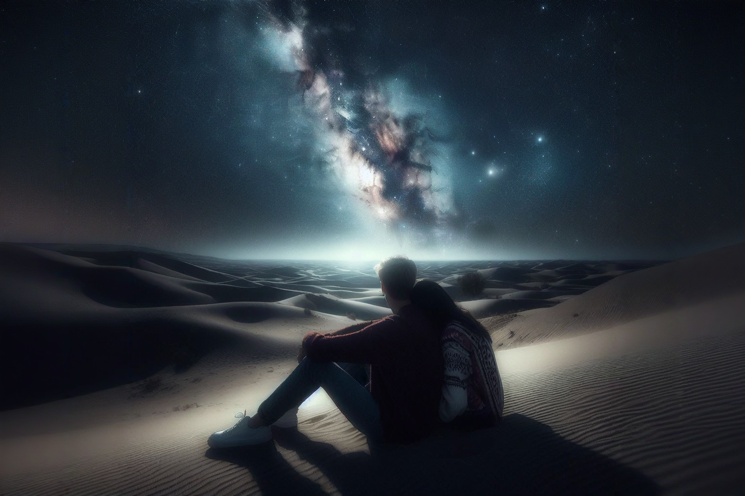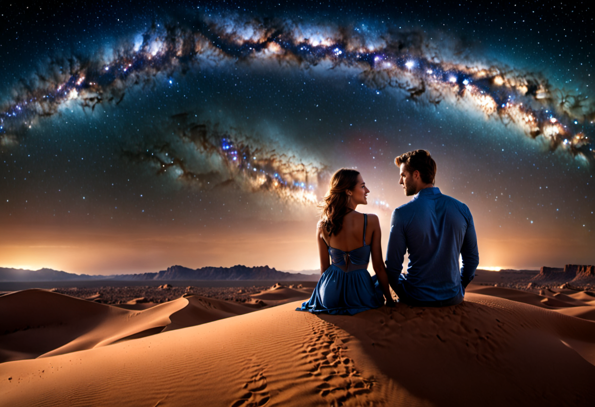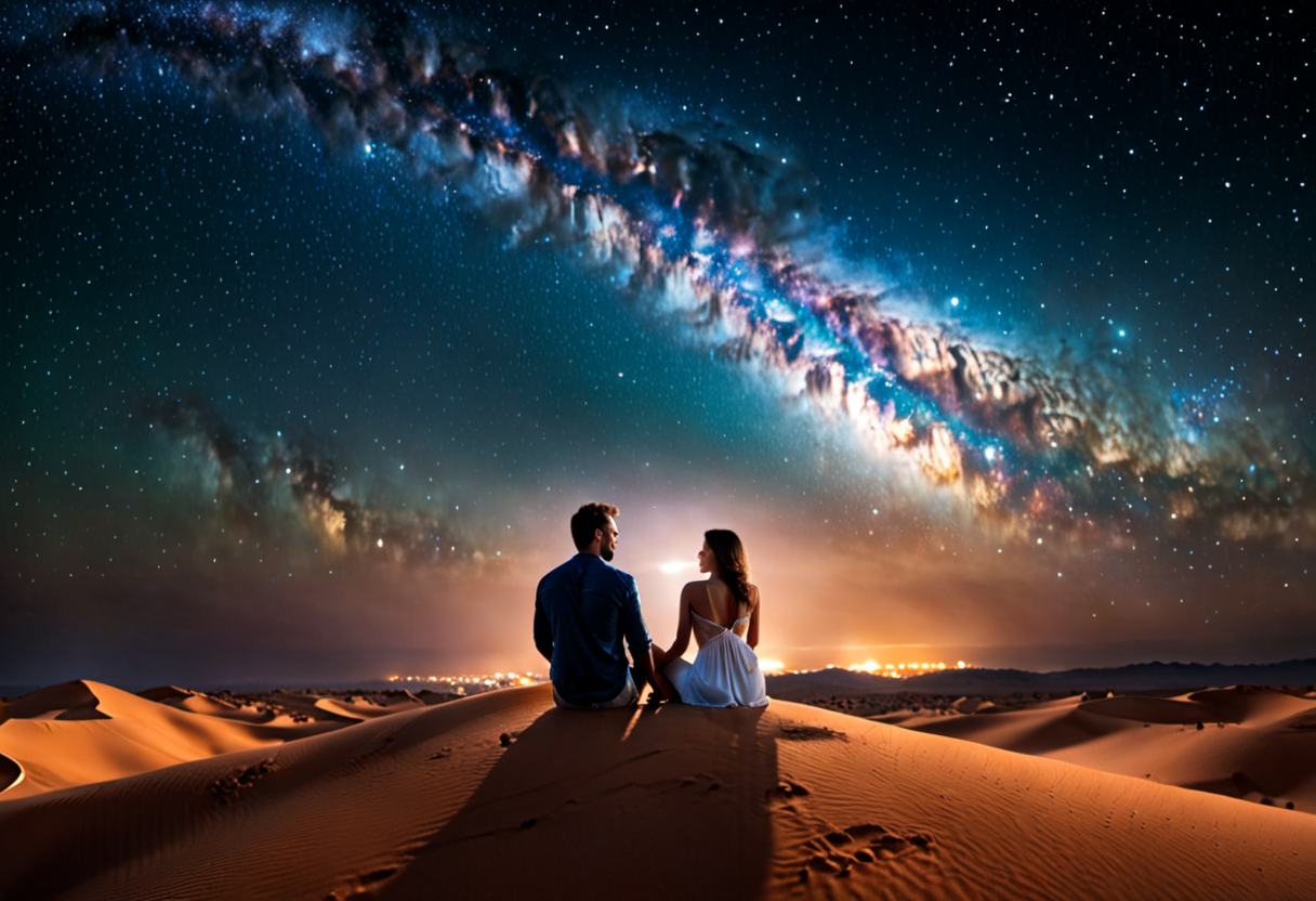프롬프트 : 깜깜한 밤 하늘에는 은하수가 떠있다. 연인들이 황량한 사막 언덕에 앉아 어깨를 기대고 소곤대고 있다깜한 밤 하늘에는 은하수가 떠있다. 연인들이 황량한 사막 언덕에 앉아 어깨를 기대고 소곤대고 있다.