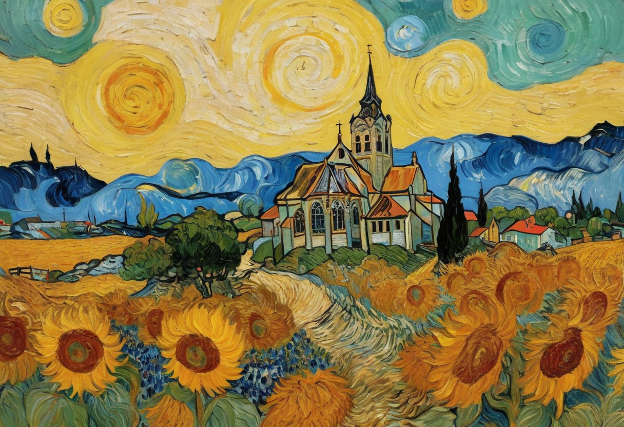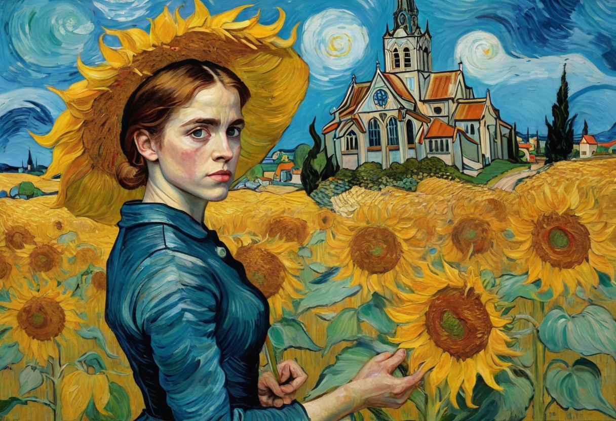 프롬프트: Emma Watson, a sunflower field, village and church in the background [스타일: Mk Van Gogh]