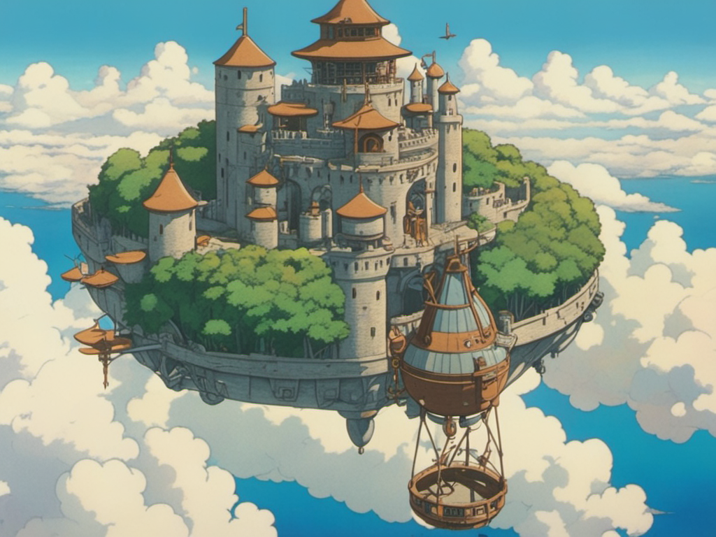 DVD screengrab from studio ghibli movie, castle in the sky, aerial shot, flying machines, aesthetic, designed by Hayao Miyazaki, retro anime [StyleSelectorSDXL-enhance]