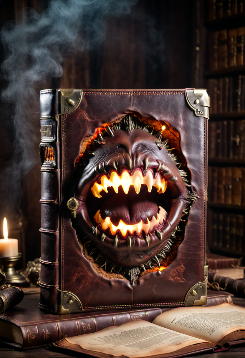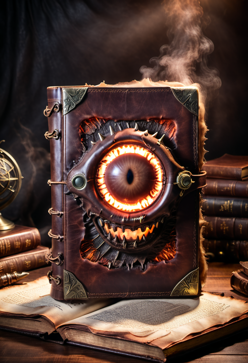 프롬프트 : professional product shot, necromancy book with old deep brown leather cover, a screaming mouth with teeth big glowing eyeball inside, placed on the desk, a magical environment