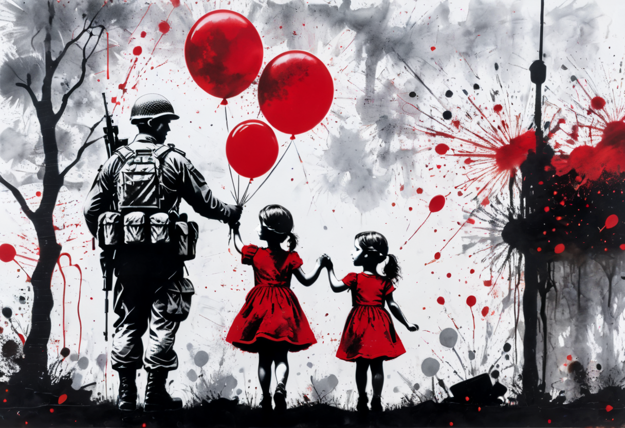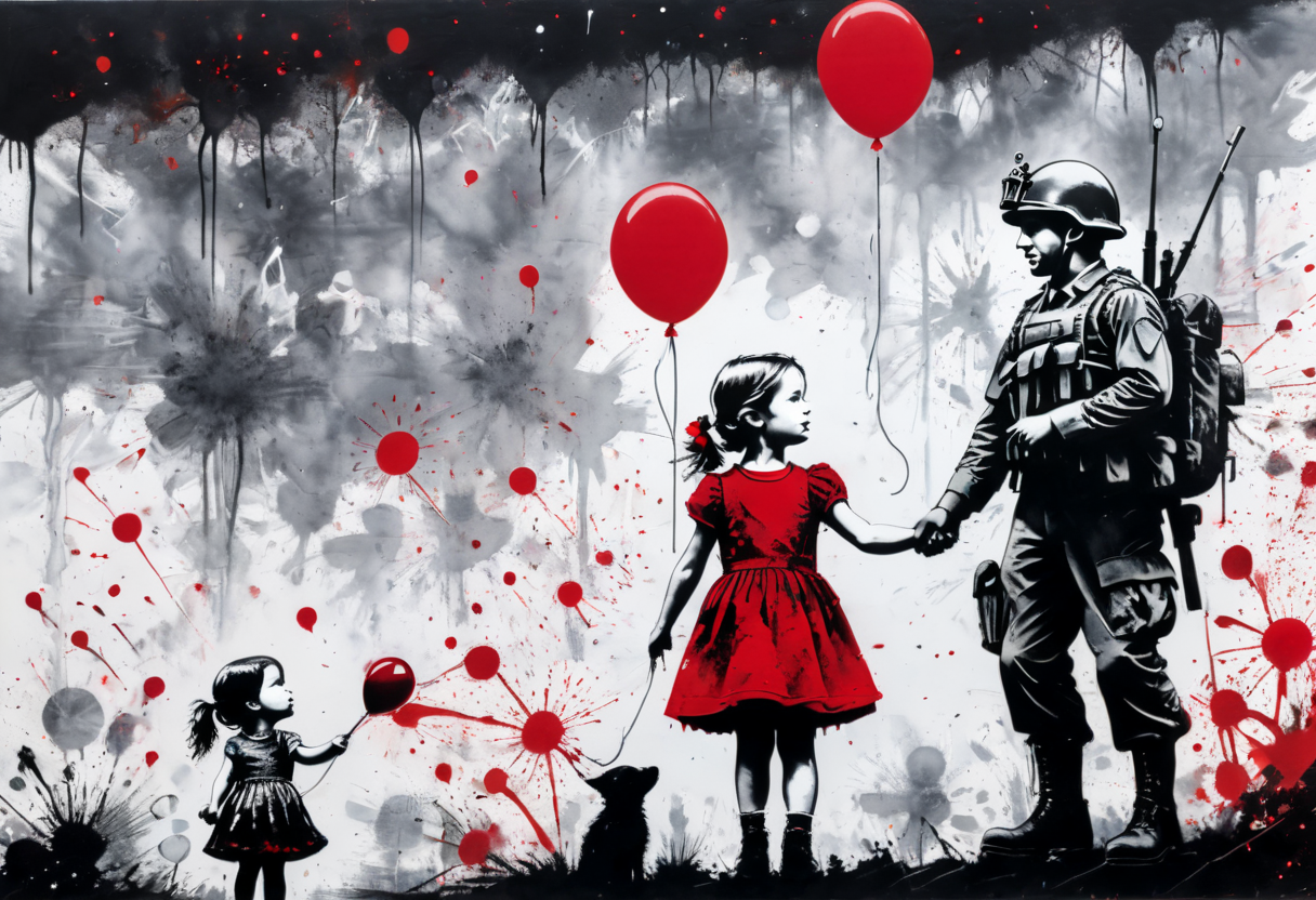 프롬프트: a black and white painting of a little girl red dress, side view, giving a red balloon to an adult army soldier holding a rifle,  with red paint splatters, , with a black and white background, by Banksy, incredible art, graffiti art, modern european ink painting