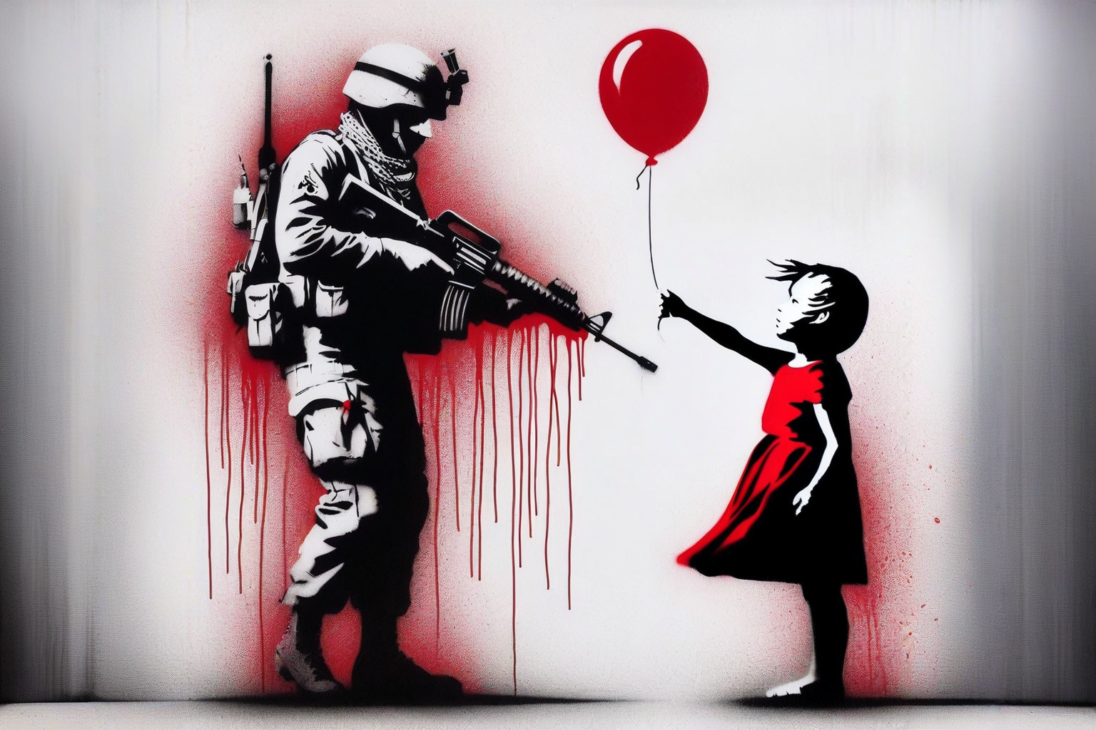 전쟁의 비참한 현실 속에서 빨간 풍선을 군인에게 선물하는 소녀의 그림은 희망과 인간성의 빛을 나타냅니다. 이 작품은 전쟁의 암울함과는 대조적으로, 어둠 속에서 빛나는 희망의 상징으로서 소중한 메시지를 전합니다. 소녀의 순수한 마음은 무력과 파괴보다 강력하며, 용기와 사랑은 어떤 역경도 극복할 수 있다는 것을 상기시킵니다. 이 작품은 전쟁의 비극을 넘어서 인간의 인간에 대한 믿음을 강조하며, 우리에게 희망과 영감을 주는 미술의 힘을 보여줍니다.