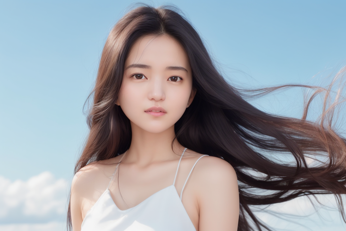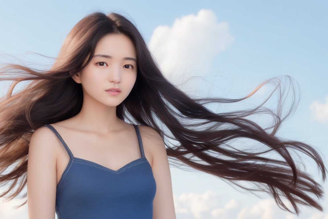 프롬프트: a beautiful 20yo woman, long hair blowing in the wind, simple background sky