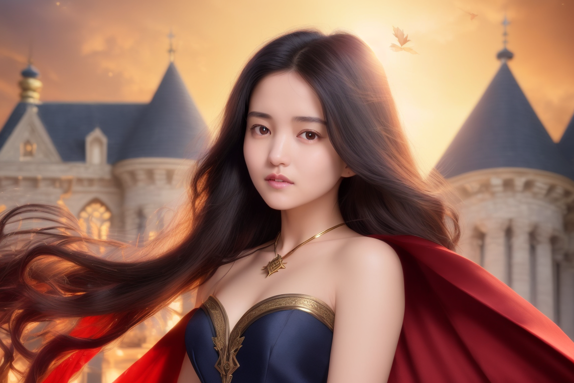프롬프트: cinematic movie still of a girl with red long hair blown by wind, dark black blue cape, maple leaves, castle on the background, detailed beauty portrait, very detailed background, treasures, wallpaper hd, avatar image, evelyn, 8k hd wallpaper, main character, grimoire page, brave young girl, vintage art, portrait of merlin, hearthstone concept art, inspired by Magali Villeneuve, fantasy art, photorealistic, dark theme, dramatic lighting, golden necklace, head chain, ornate, Ana de Armas, amber heard
