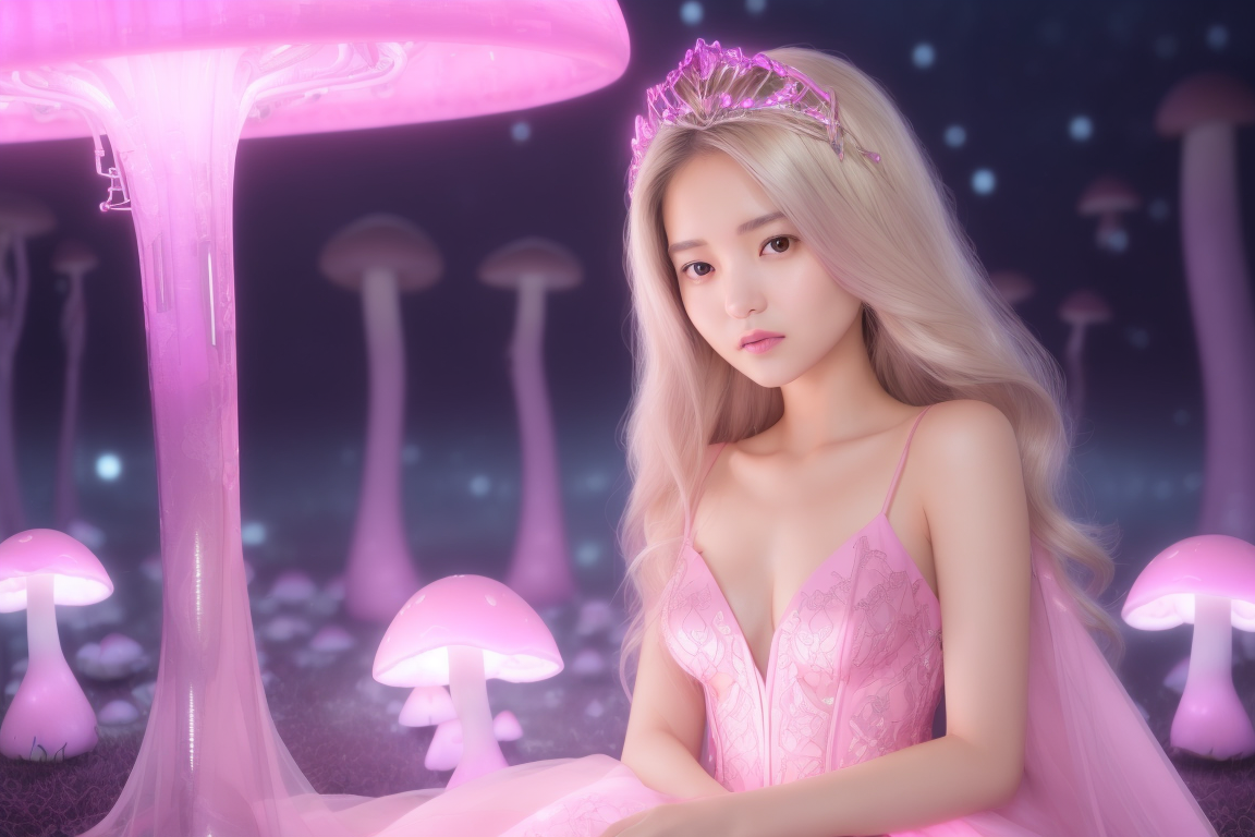 sit on floor, realistic beautiful princess in mushroom land, blonde, highlight hair,, intricate , slim body, (pink princess gown:1.2), night, deep (darkness:1.2), growing mushrooms, dim light, fantasy, bokeh, perfect face, looking intently at you