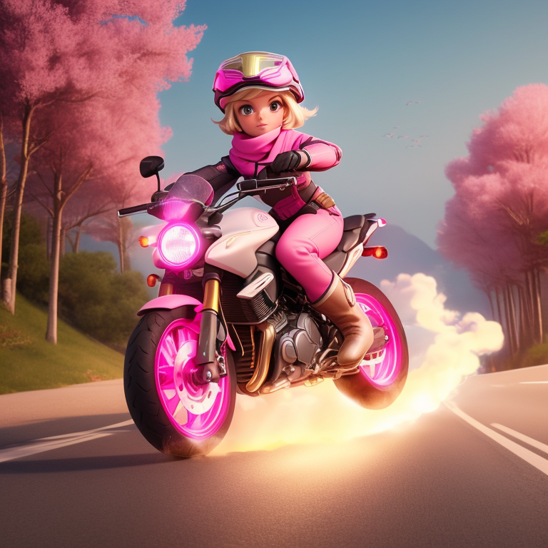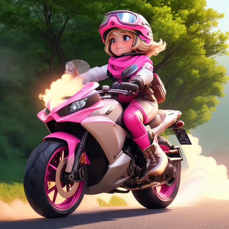 프롬프트 : a girl riding a motorcycle, 1girl, pink long upper shan, ground vehicle, solo, gloves, motor vehicle, helmet, black eyes, boots, goggles, white gloves, blonde hair, riding, scarf, short hair, smoke, C4D, 3D, running on the road, tree