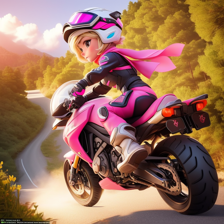 프롬프트: A cute anime-style girl wearing a pink and black biker suit rides a sleek pink motorcycle down a narrow dirt path winding through dense green bushes. The motorcycle speeds away into the distance as the girl looks intently ahead, her determined expression capturing the thrill of the ride in this vibrant and dynamic scene.