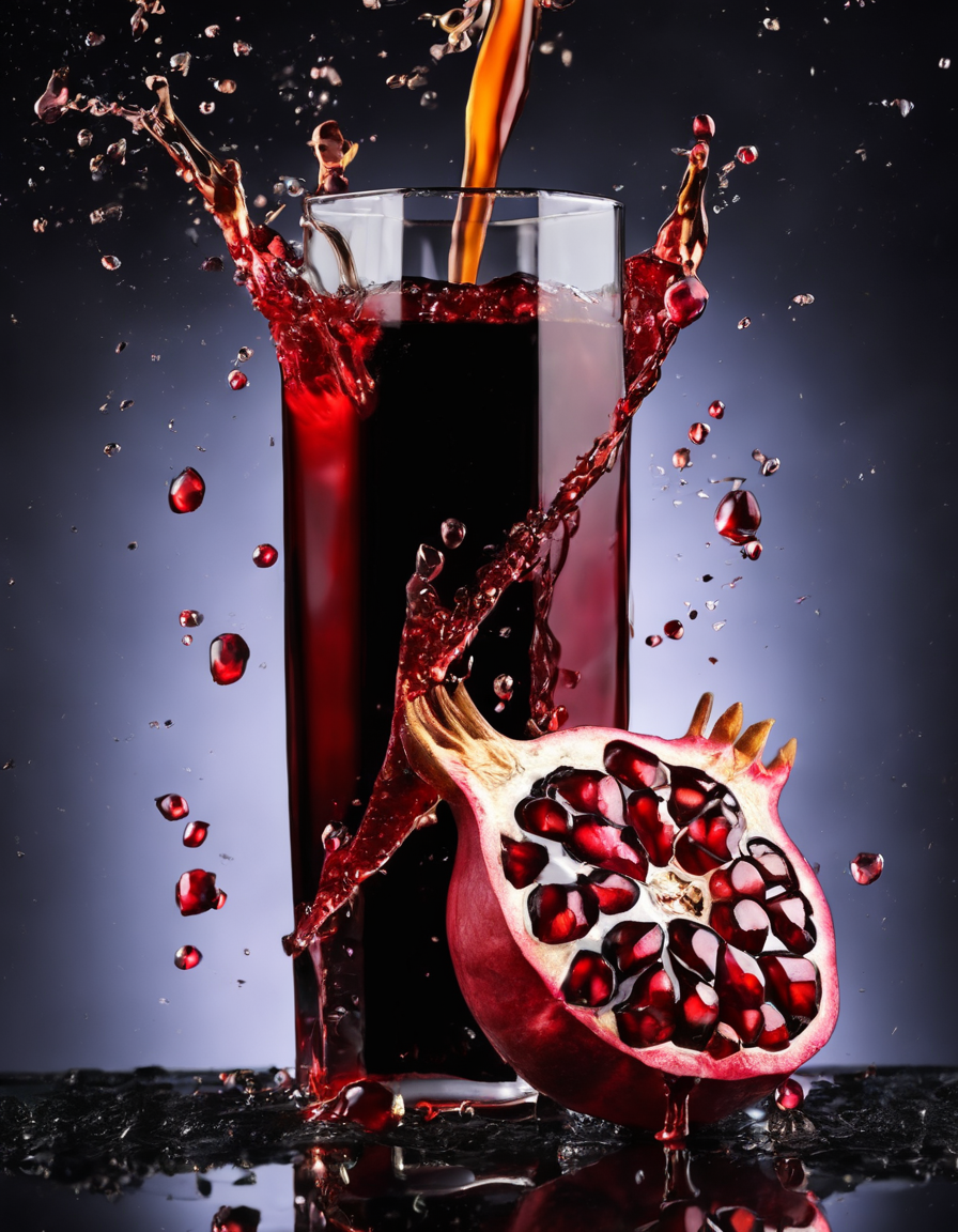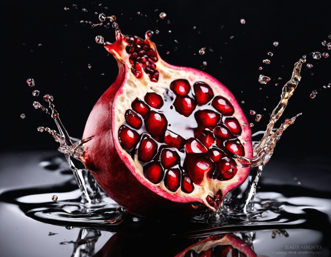 (single:1.9) pomegranate, (liquid juice splashes:1.35), photography, (black background:1.5), 200 mm lens, close up shot, sharp focus, wallpaper, 8k, high resolution render, cinematic, epic scale, volumetric lighting, ultra wide angle, intricate details, vibrant colors [Style Selector - food photo]