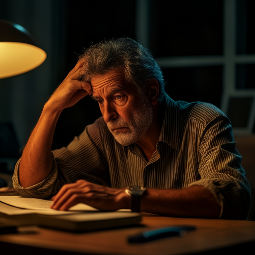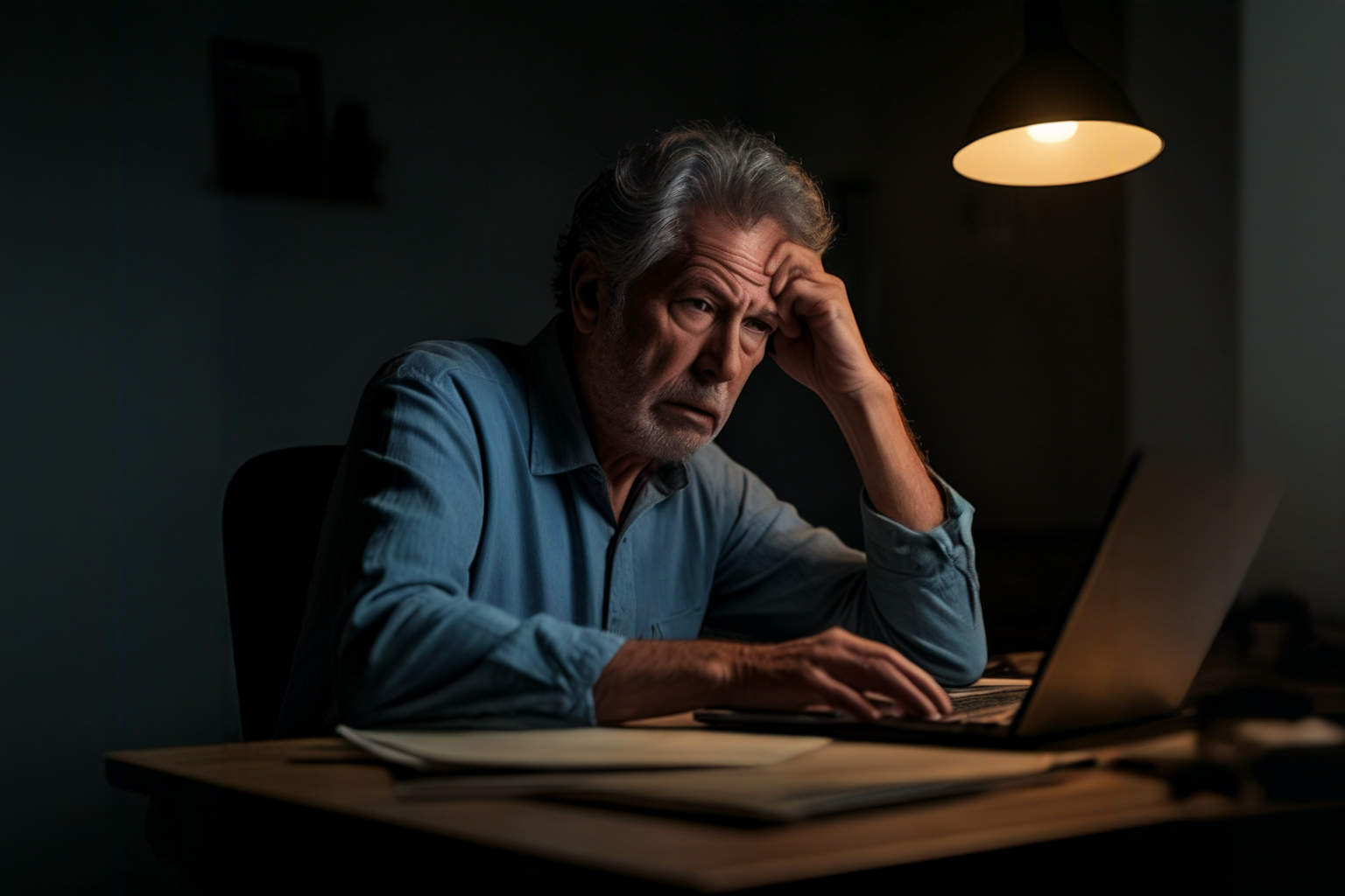 (밤 늦도록 머리를 쥐어뜯으며 컴퓨터 앞에서 보고서를 작성하는 50대 남자)