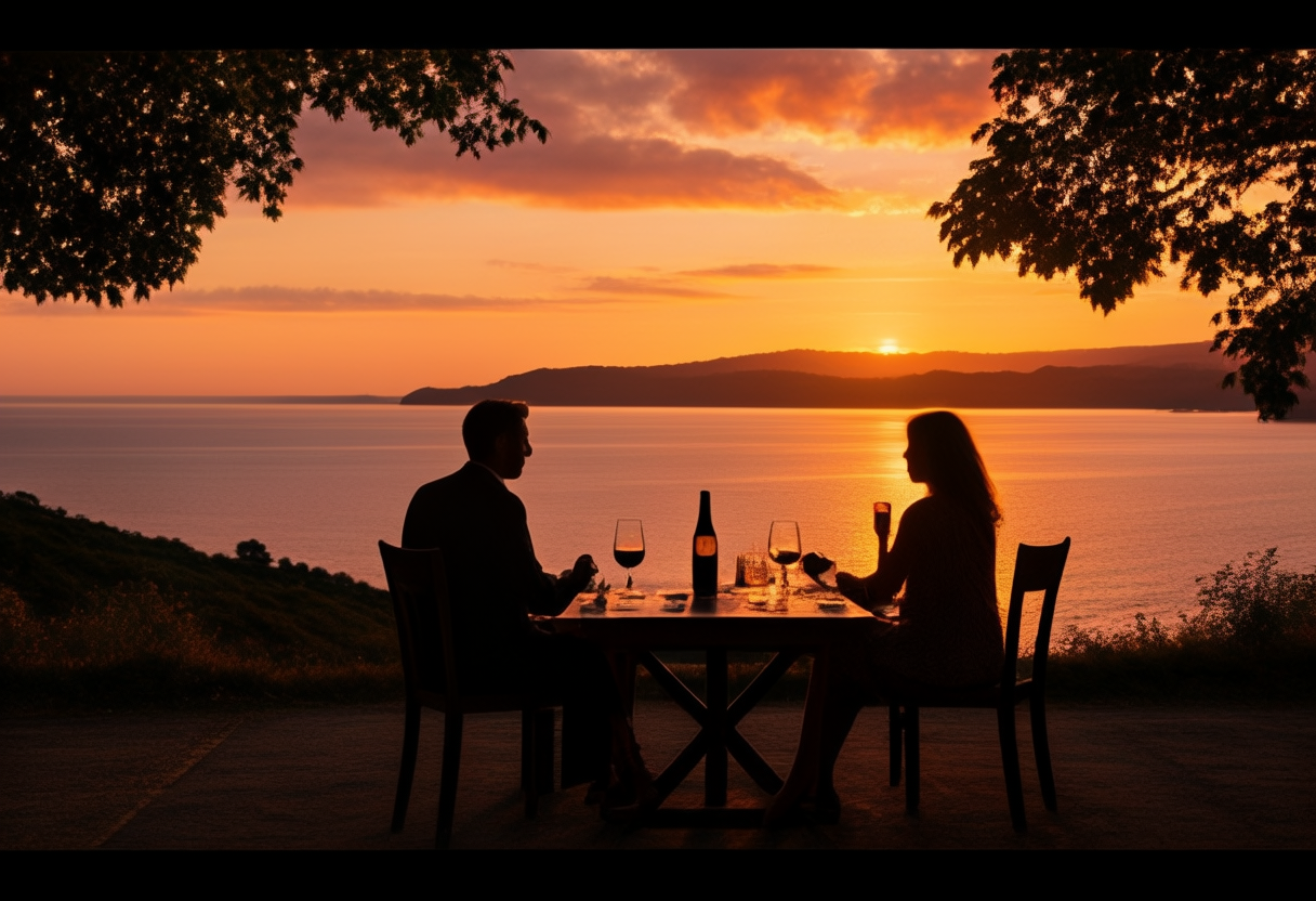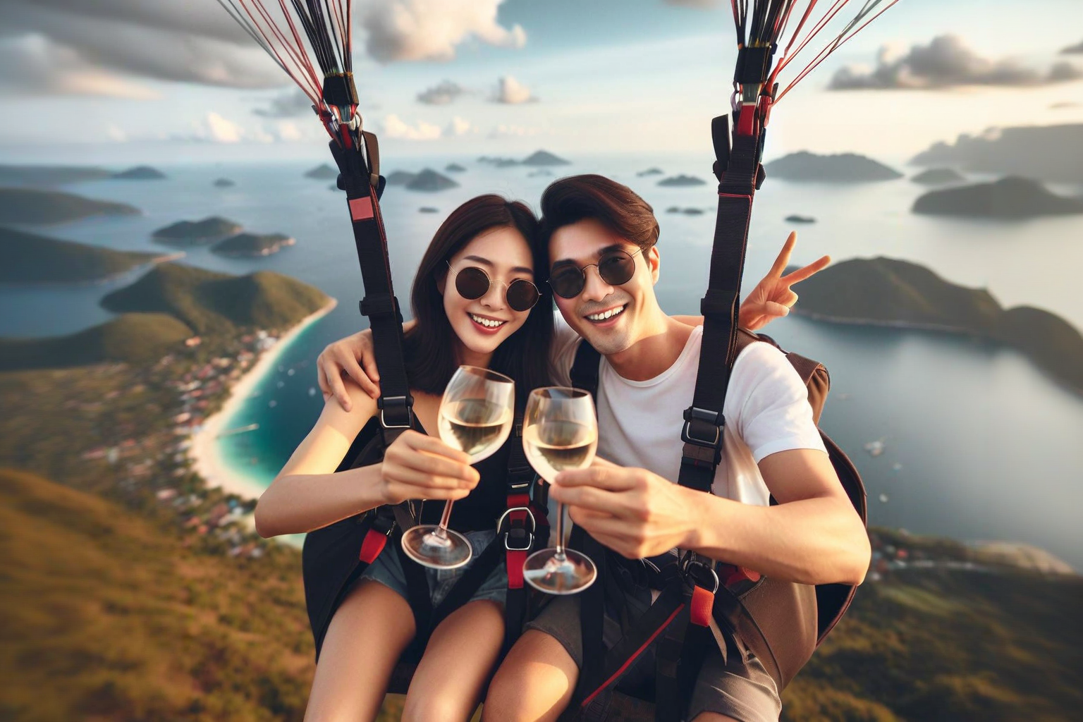 DALLE-3 프롬프트: 나란히 패러 글라이딩을 하면서 와인잔을 부딛치고 있는 부부. 아래로 바다와 섬들이 보인다.