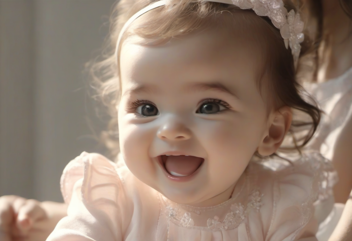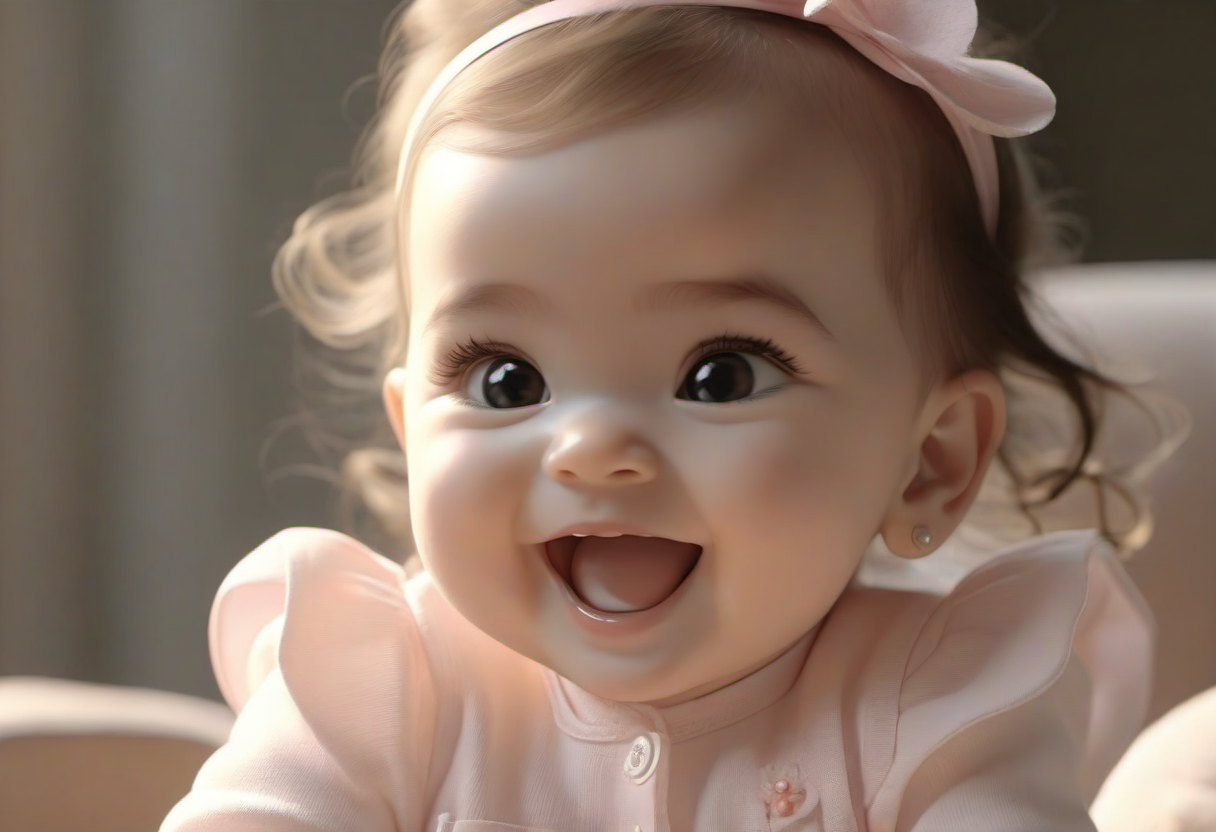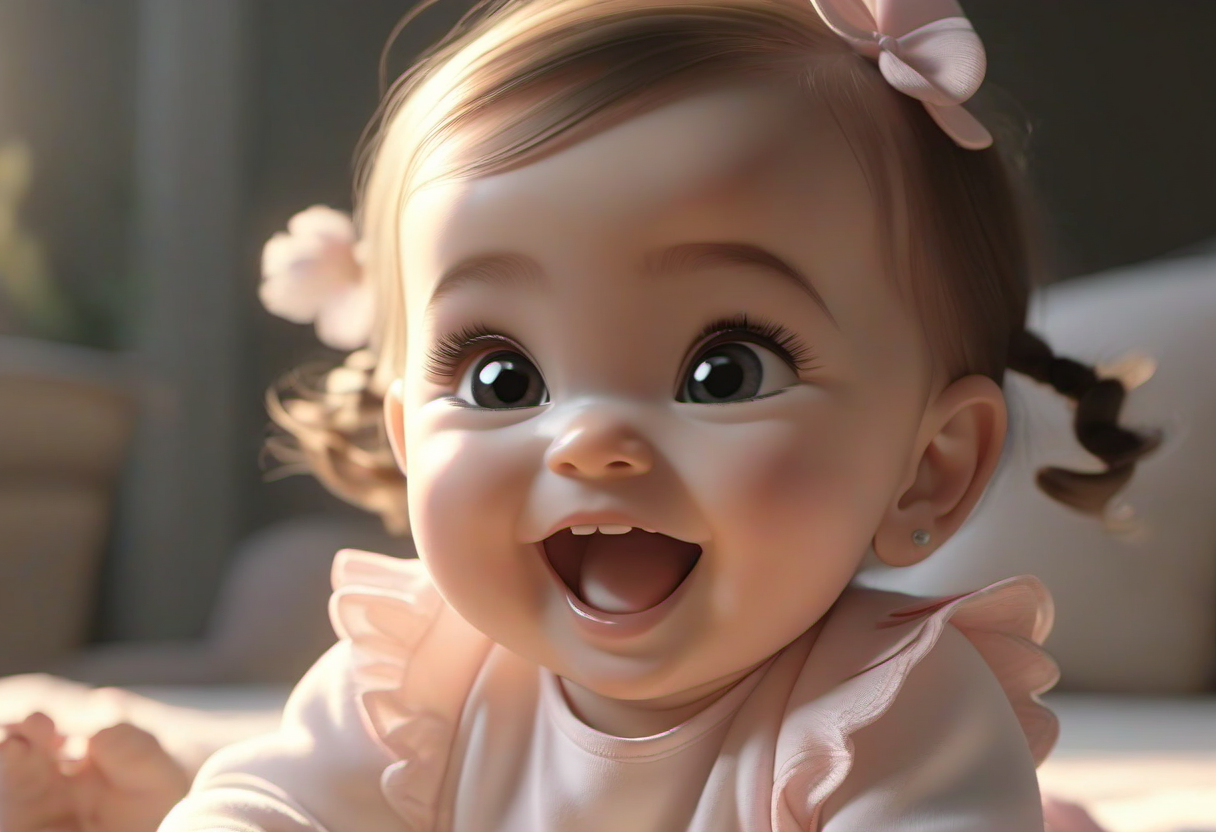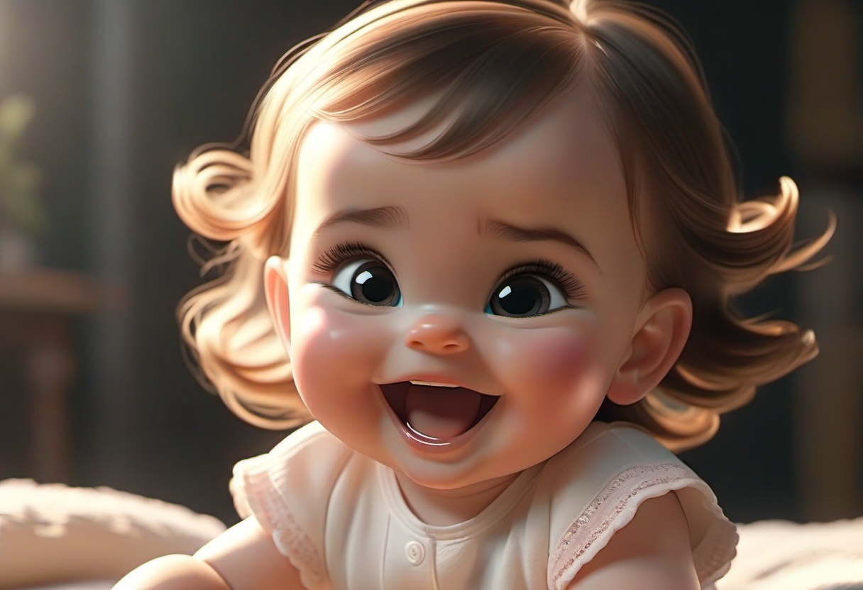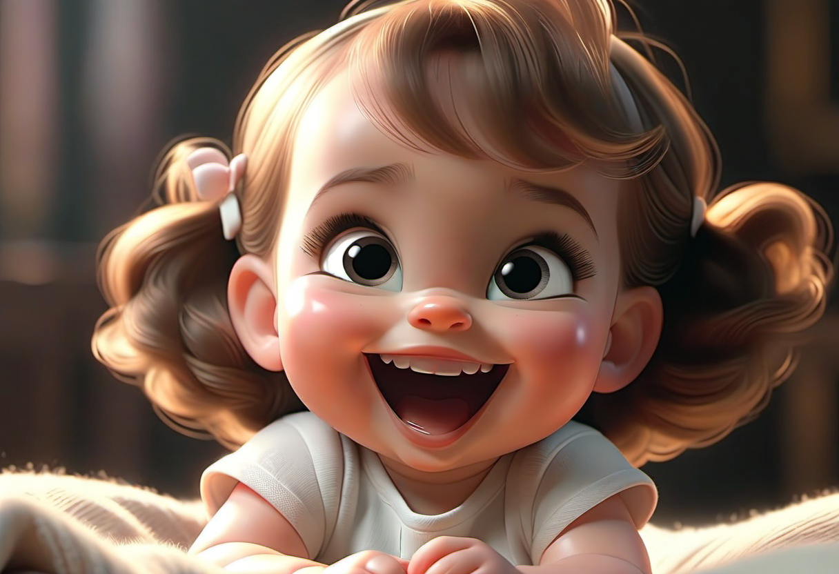 프롬프트: 3D film, natural lighting, 4k, highly detailed, A baby girl laughing very hard