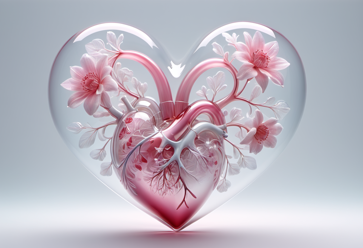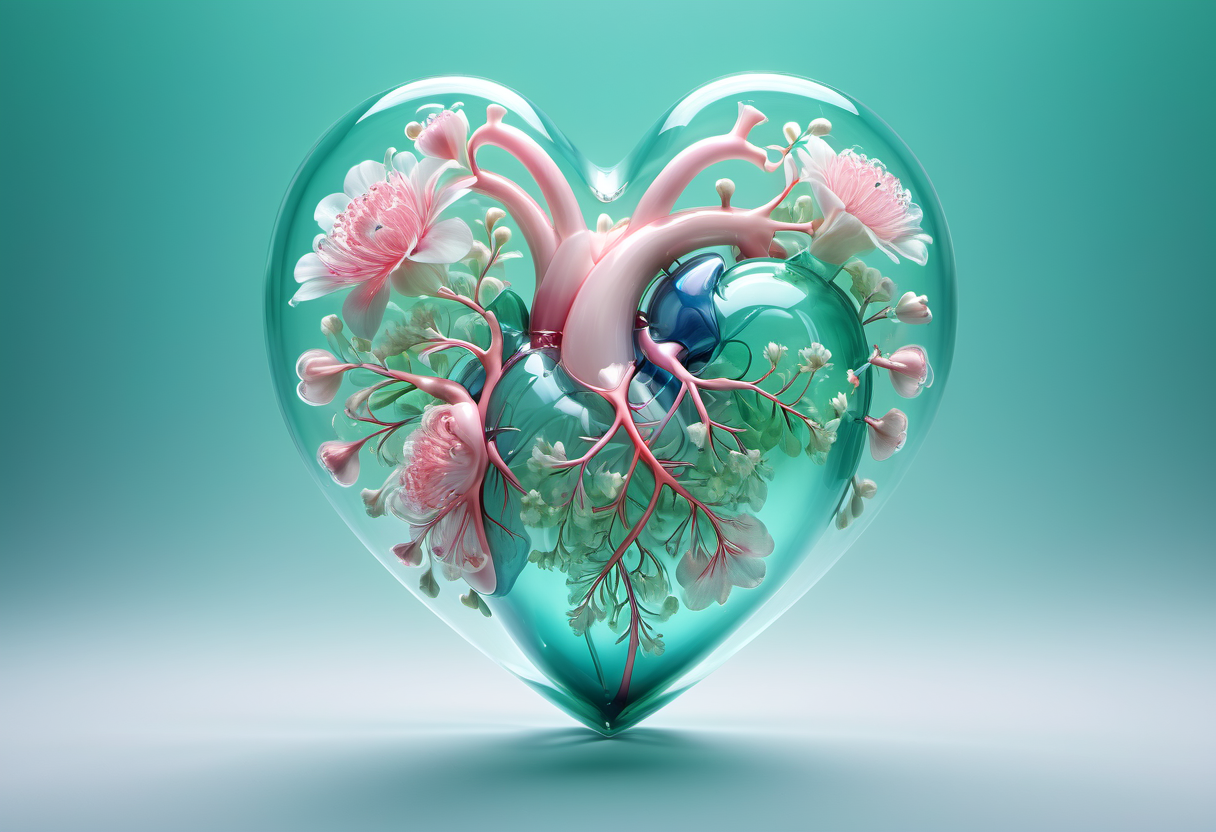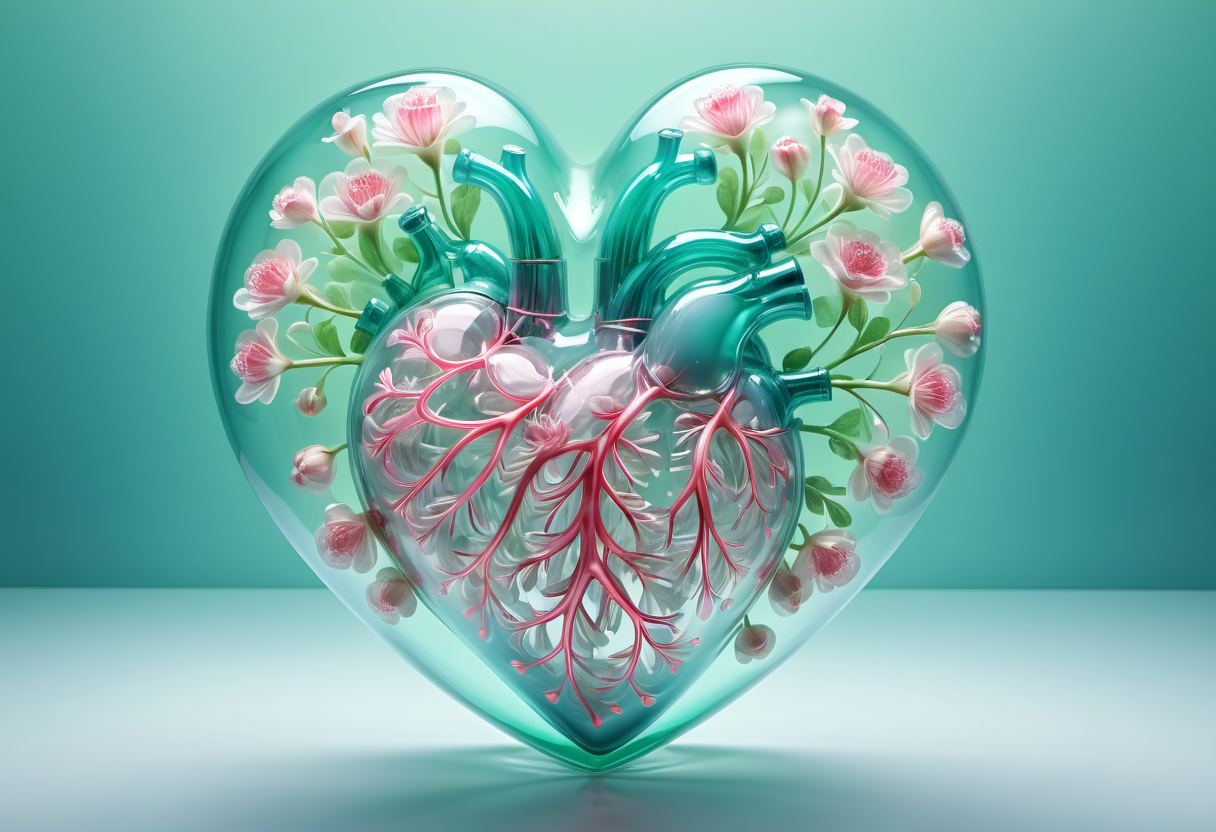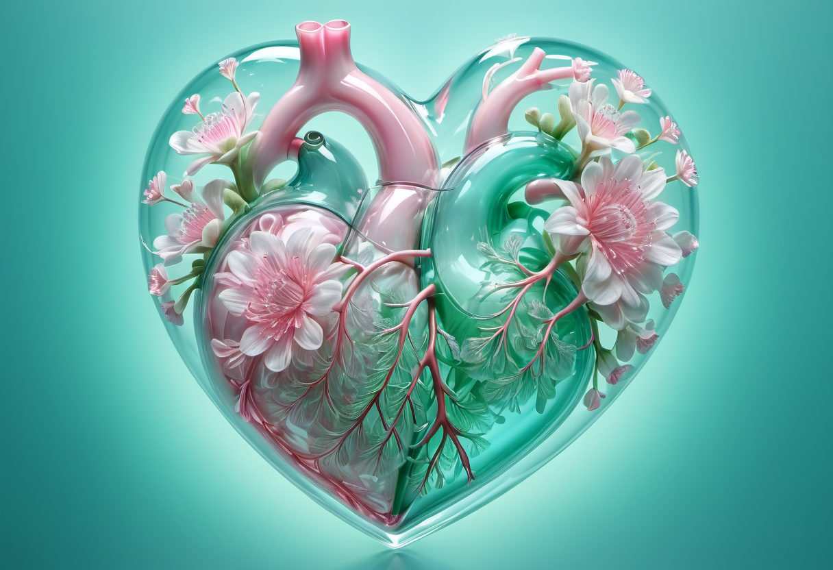 프롬프트 : highly detailed, 3D glass heart with glowing inside, Aorta, bluish pulmonary artery, veins, gradient, gradient_background, white pink flowers, green petals, transparent, still_life