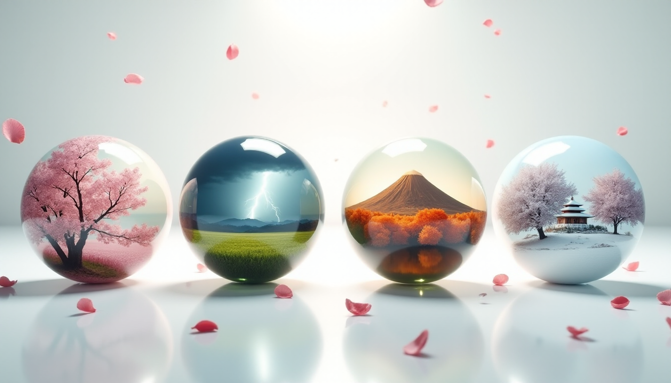 프롬프트: In a clean white space, four glass spheres are arranged in a line. The sphere on the far left depicts a spring landscape with blooming cherry blossoms. The second sphere shows a stormy plain with heavy rain pouring down and lightning striking the ground. The third sphere features a mountain covered in vivid red and yellow autumn leaves. The final sphere on the right displays a serene winter scene of a lakeside pavilion blanketed in snow. A soft light source shines from behind the spheres, casting a radiant glow, while small petals drift gently around them, enhancing the peaceful and dreamlike ambiance.