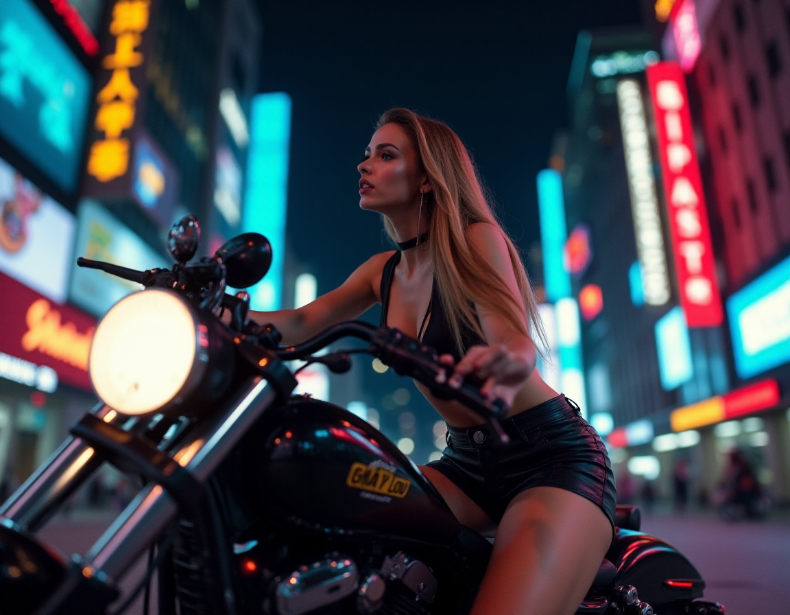 밤의 도시는 네온빛으로 물들어 몽환적인 분위기를 자아낸다. 어둠 속, 낮은 시선에서 보이는 그녀는 가죽 톱과 짧은 가죽 바지를 입고 강렬한 카리스마를 뿜어내며 오토바이에 앉아 있다. 바이크의 금속 광택은 네온 조명과 어우러져 반짝이고, 그녀의 실루엣은 도시의 혼란 속에서도 고요한 자신감을 드러낸다. 건물 사이로 흐르는 사이버펑크 세계의 차가운 공기가 그녀의 존재로 인해 따뜻하게 깨어나는 듯하다.