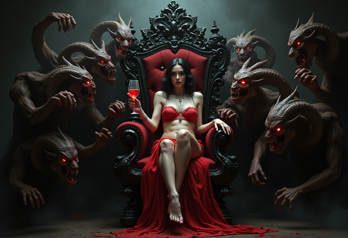 프롬프트: A dynamic, oblique angle view reveals a powerful, enigmatic woman seated on an ornate, dark throne, her posture regal and commanding. In one hand, she holds a delicate wine glass filled with a glowing, otherworldly red liquid, which seems to pulse with life. Surrounding her are grotesque, twisted demons of various shapes and sizes, each contorted in chaotic, aggressive postures, their glowing eyes fixated on her. demons’s hand trying to reach and touch her. She’s relaxed and sits with ease.( 역동적인 비스듬한 각도에서 보면 화려하고 어두운 왕좌에 앉은 강력하고 신비로운 여성이 당당하고 위엄 있는 자세로 앉아 있는 모습이 드러납니다. 한 손에는 생명력이 넘치는 듯 빛나는 붉은 액체가 담긴 섬세한 와인 잔을 들고 있습니다. 그녀 주변에는 다양한 모양과 크기의 기괴하고 뒤틀린 악마들이 혼란스럽고 공격적인 자세로 뒤틀린 채 빛나는 눈으로 그녀에게 집중하고 있습니다. 악마들의 손이 그녀에게 다가가 만지려고 합니다. 그녀는 편안하게 앉아 있습니다.)