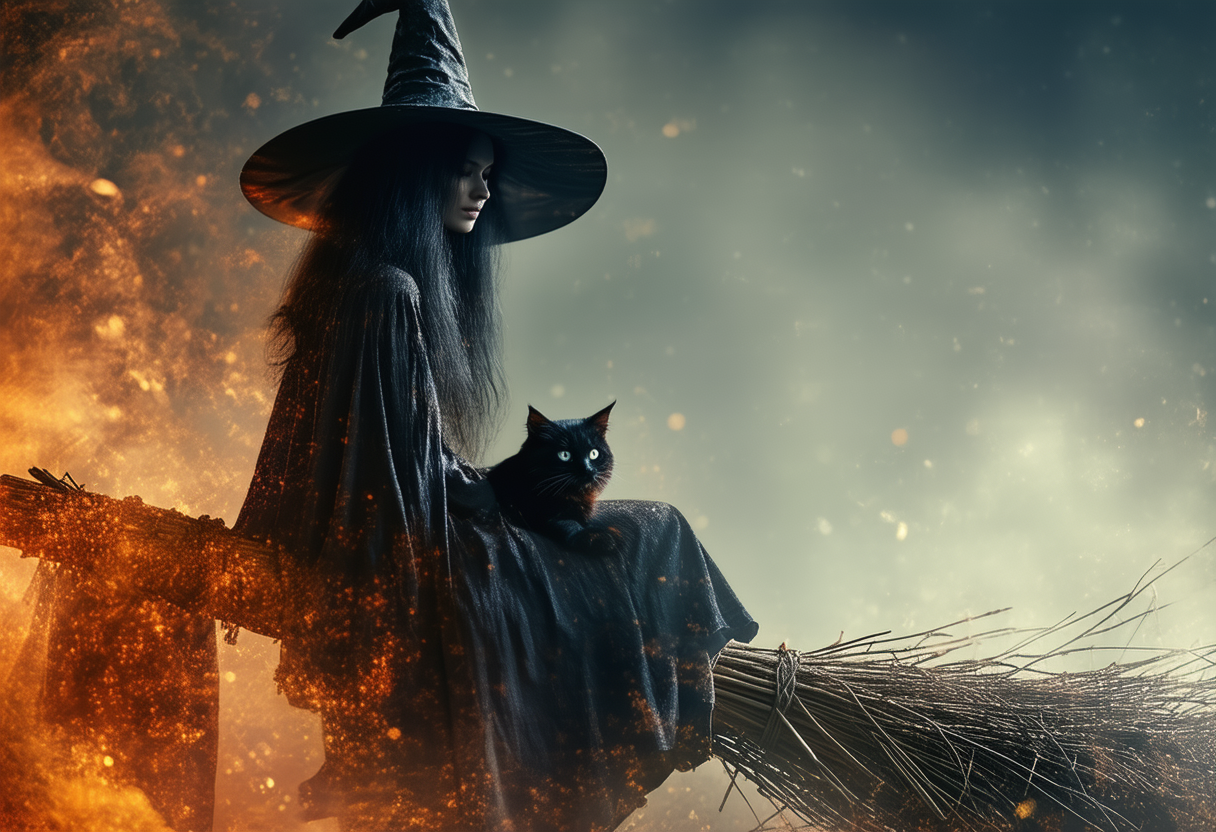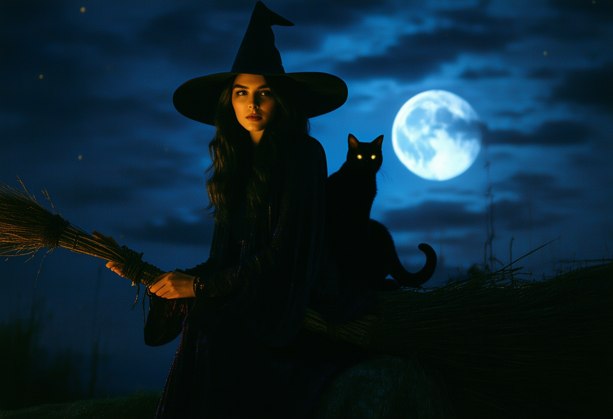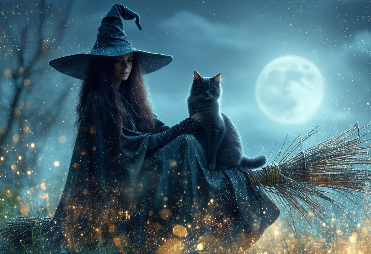 프롬프트: An ultra-detailed, semi-realistic photo of a witch and her cat sitting on a broomstick, The witch, with a clearly visible face, wears a pointed hat and a long, flowing cloak that billows slightly in the night wind. Her expression is mysterious yet serene, with intricate facial features illuminated by the moonlight. Beautiful detailed face.