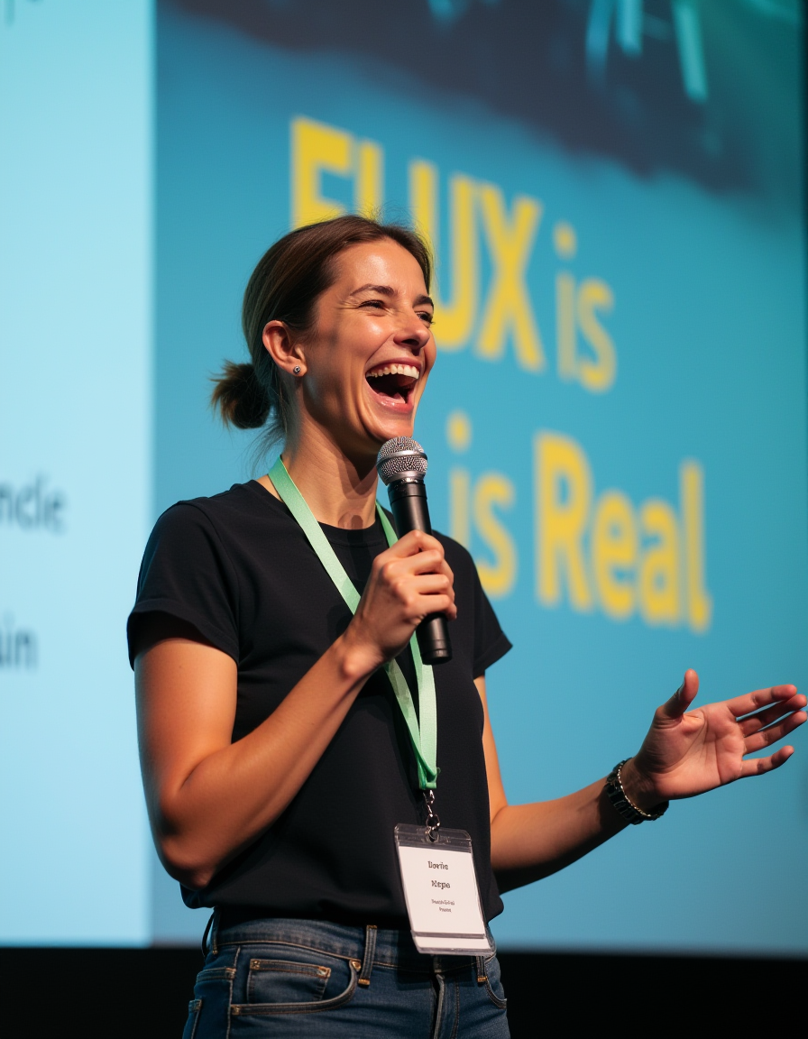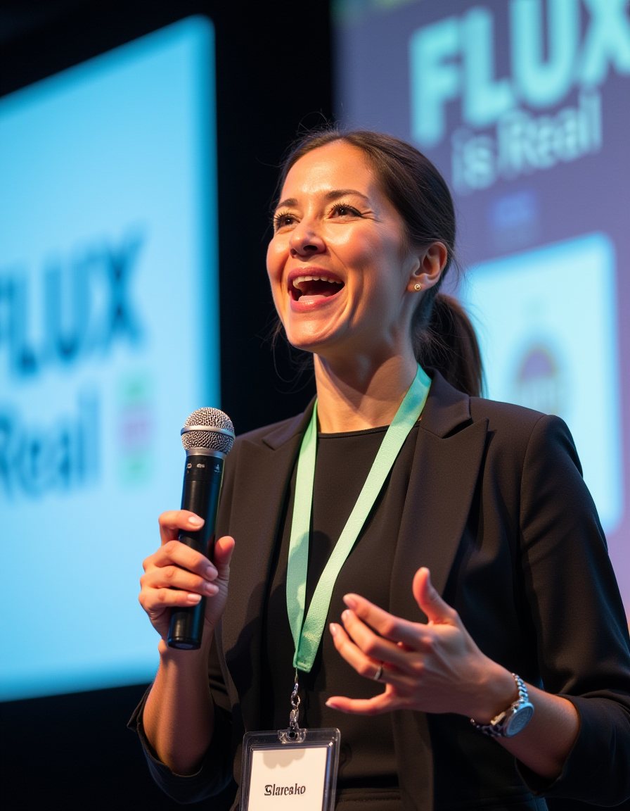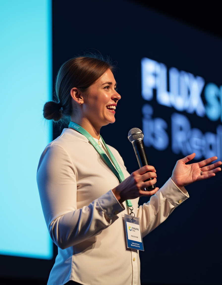 영문 프롬프트 : A passionate late-20s woman presenting at a product launch event. She holds a microphone firmly in her right hand while speaking with enthusiasm, her mouth open mid-sentence. Her hair is neatly tied back, and she wears a light green lanyard around her neck with a name tag attached to her chest. Her left hand is slightly extended forward, emphasizing her points. In the background, a large presentation screen displays a slide with the bold text 'FLUX is Real,' adding to the dynamic and professional atmosphere.
